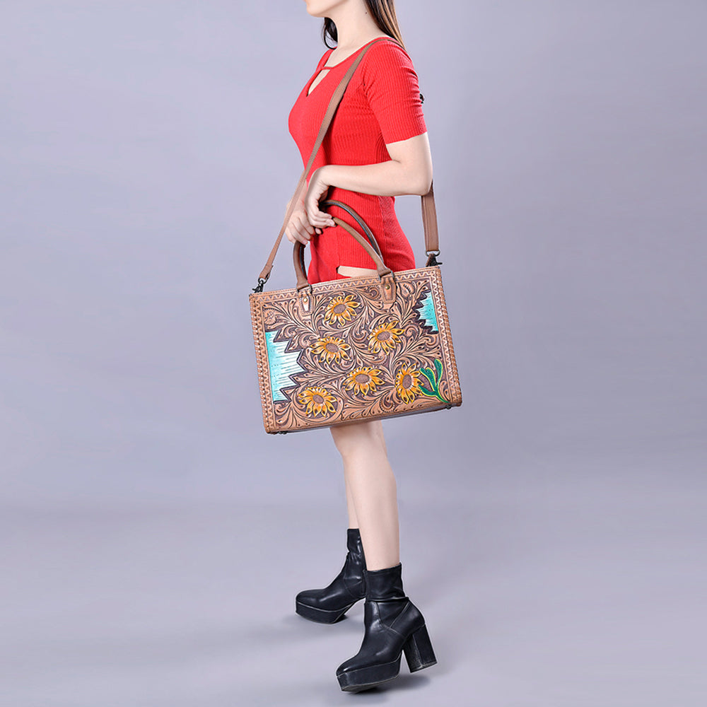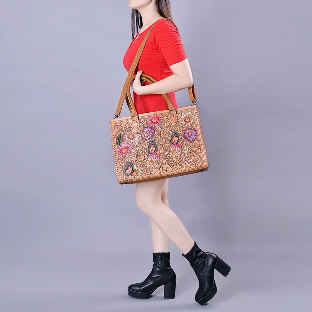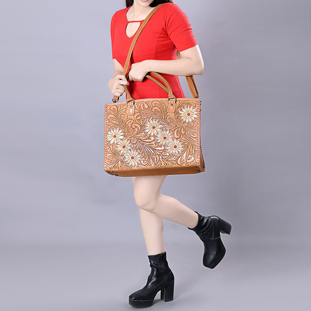 ADBG235 Hand Tooled Floral Leather Tote Bag with Adjustable Shoulder Strap