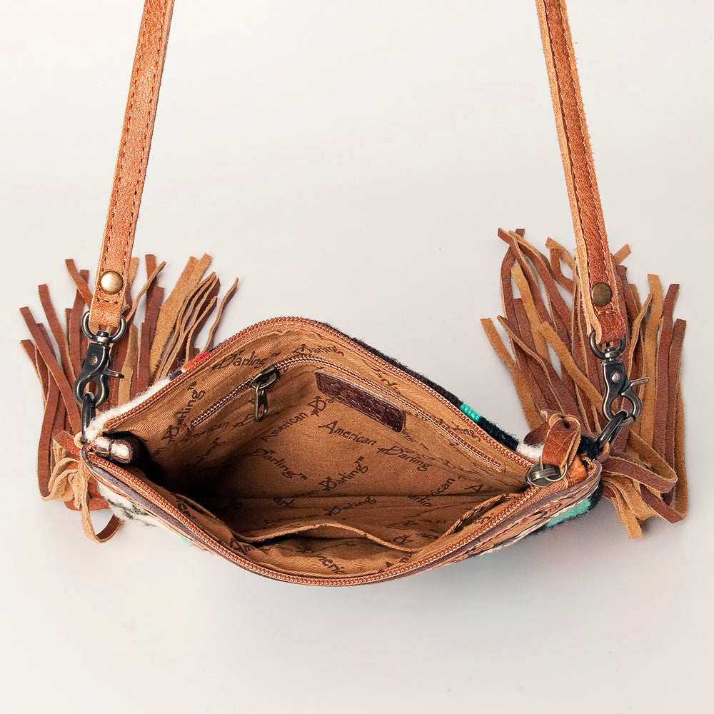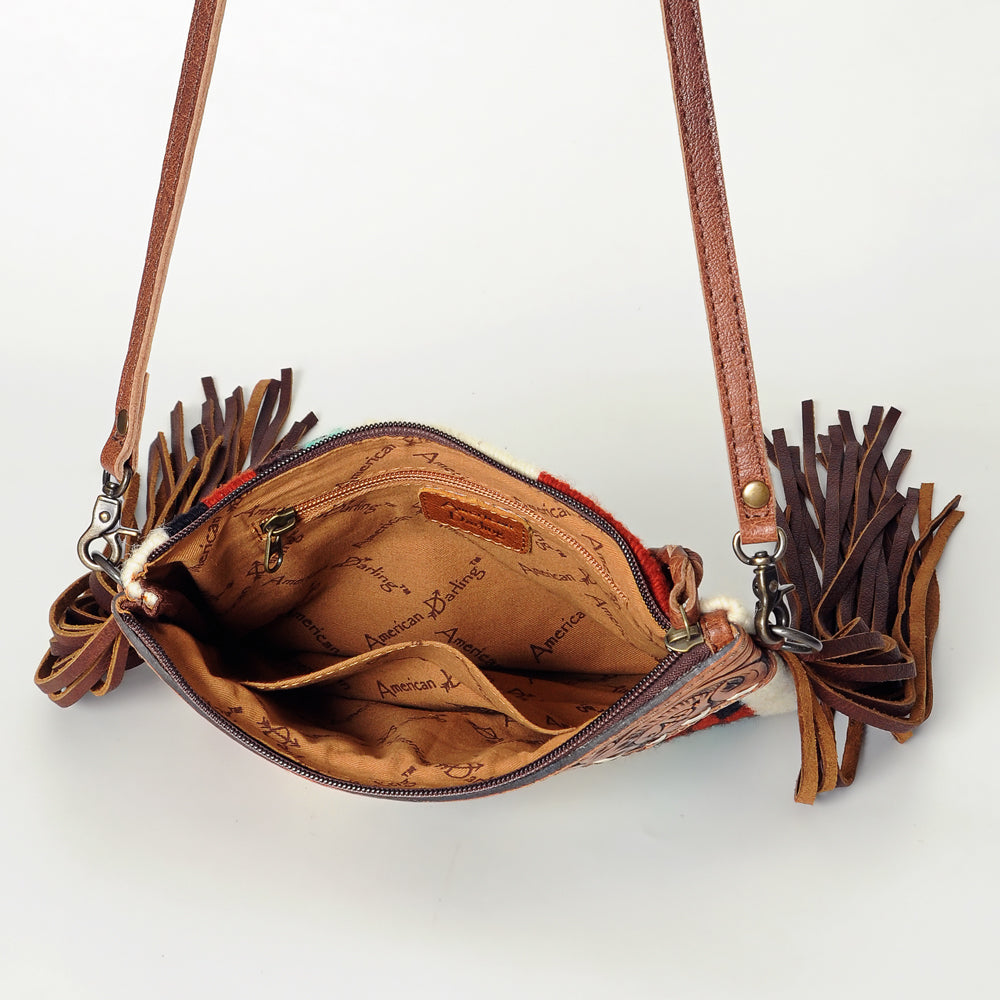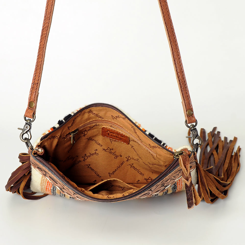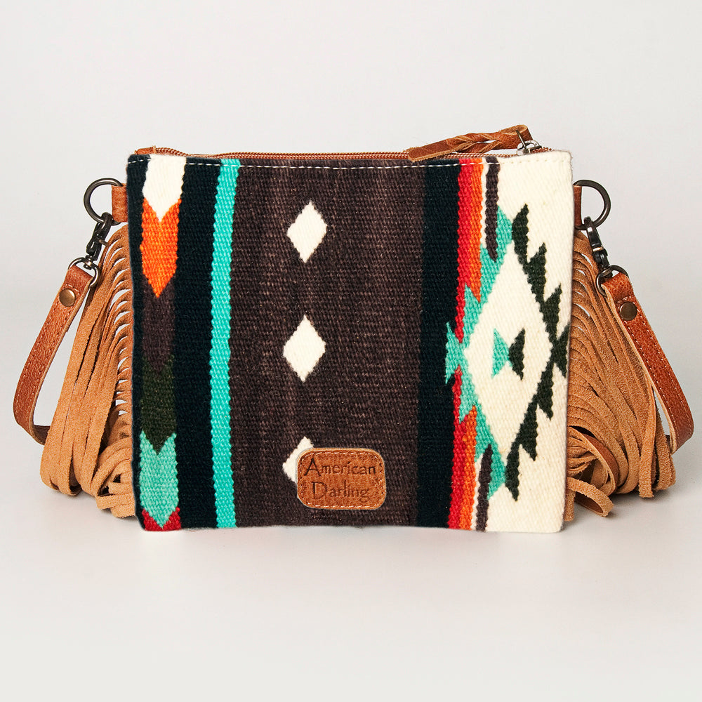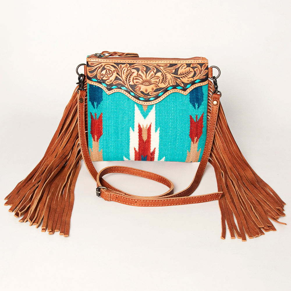 ADBG236 Hand Tooled Leather & Woven Fabric Crossbody Bag with Leather Fringes