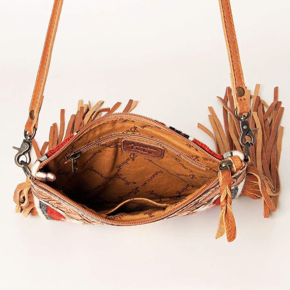 ADBG236 Southwestern Woven Fringe Crossbody Bag with Hand-Tooled Floral Leather Trim
