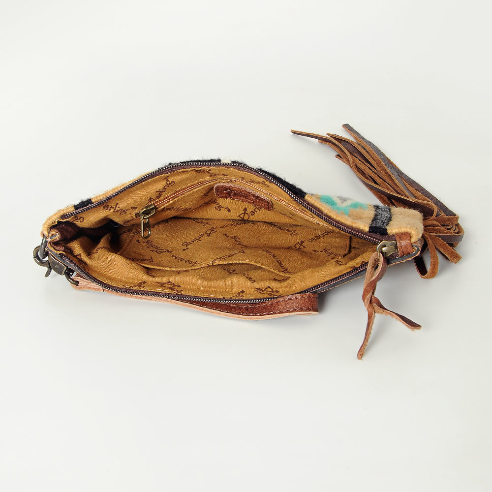 ADBG344 Southwestern Wool Wristlet Clutch with Tooled Leather Trim & Fringe Tassel