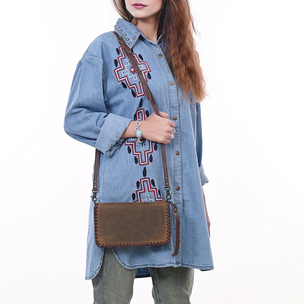 This distressed brown leather crossbody organizer bag is the perfect blend of rustic style and everyday function. The body features rich, vintage-style full-grain leather framed by hand-laced dark brown whipstitch trim for a rugged, Western-inspired finish. Designed for convenience, it includes a detachable, adjustable leather strap for hands-free wear. The interior offers organized space for your phone, cards, receipts, and other small essentials—making it ideal for travel, errands, or rodeo nights.