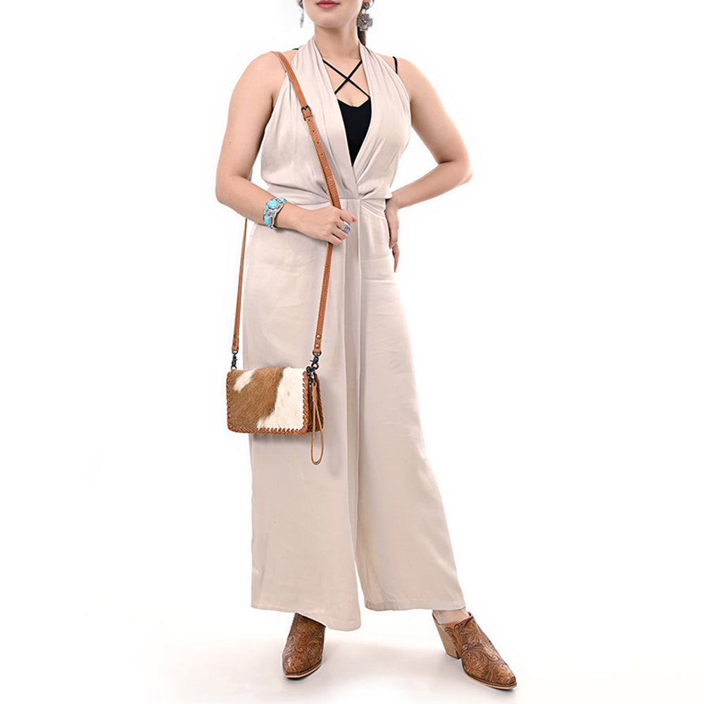 Rustic charm meets everyday function in this handcrafted cowhide Organiser bag. Featuring a natural white hair-on-hide exterior, the wallet is detailed with hand-laced dark leather whipstitching along the edges. The adjustable and removable leather strap allows you to wear it as a crossbody or carry it as a clutch. Compact and secure with a zip closure, this piece is perfect for festivals, travel, or day-to-day use with a Western twist.