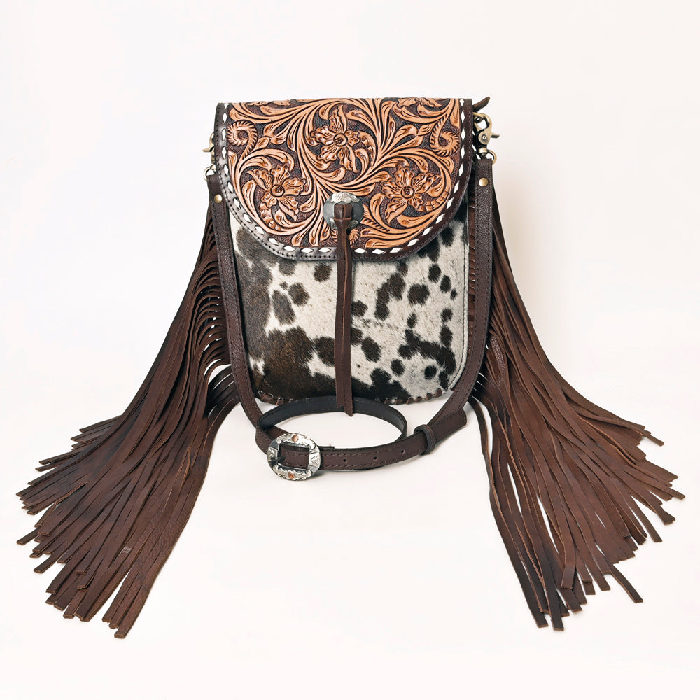 ADBGA353 Tooled Leather & Cowhide Crossbody Bag with Fringe Western Saddle Flap Purse