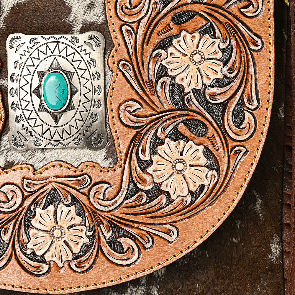 The handpicked cowhide hair-on genuine leather not only adds a soft and tactile element but also serves as an embellishment, enhancing its overall western appearance.