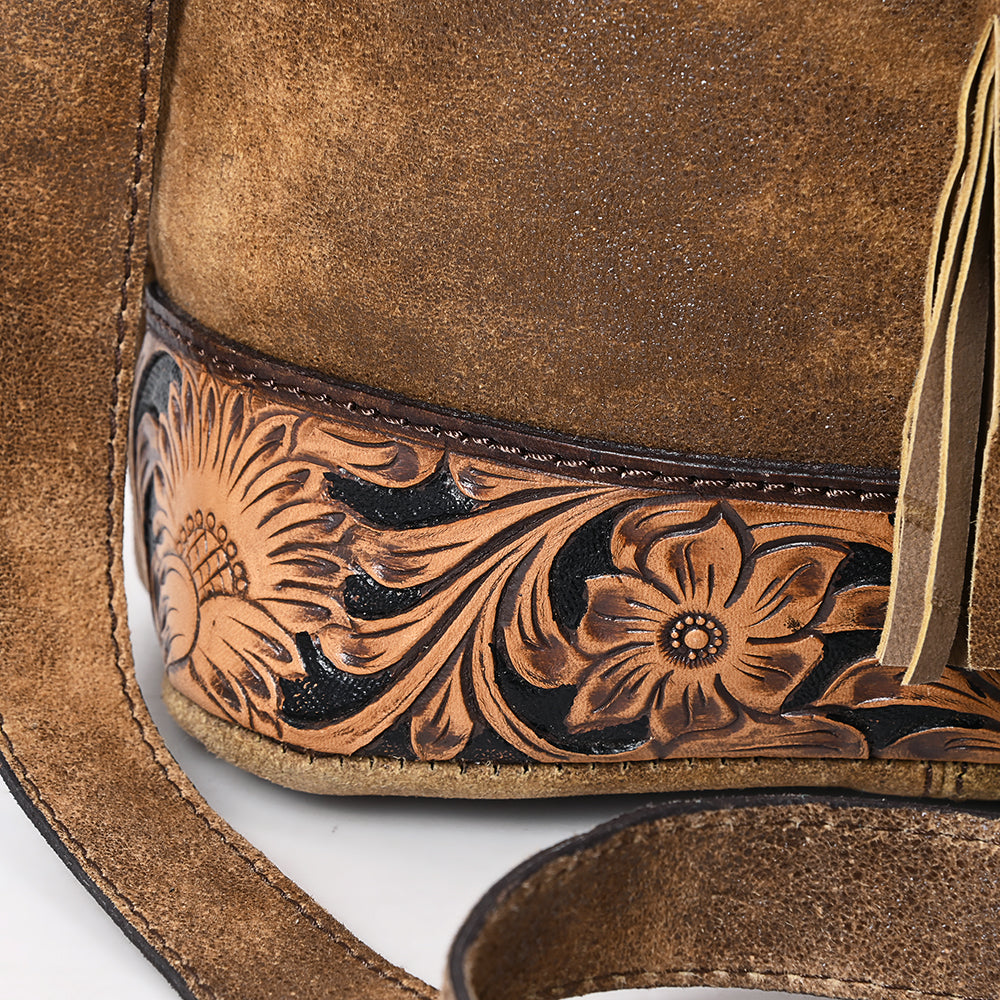 This handcrafted American Darling bucket bag blends vintage western charm with everyday utility. Made from genuine distressed leather, the bag features a hand-tooled floral leather band and a soft drawstring closure with dual tassels.