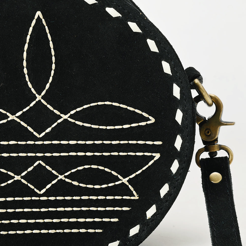 Elevate your Western style with this handcrafted round canteen bag made from premium genuine leather in a bold finish. Featuring classic Western stitching and whipstitch detailing, this unique circular crossbody adds flair to any outfit. Designed for comfort and function, it comes with a zipper closure and a leather strap.