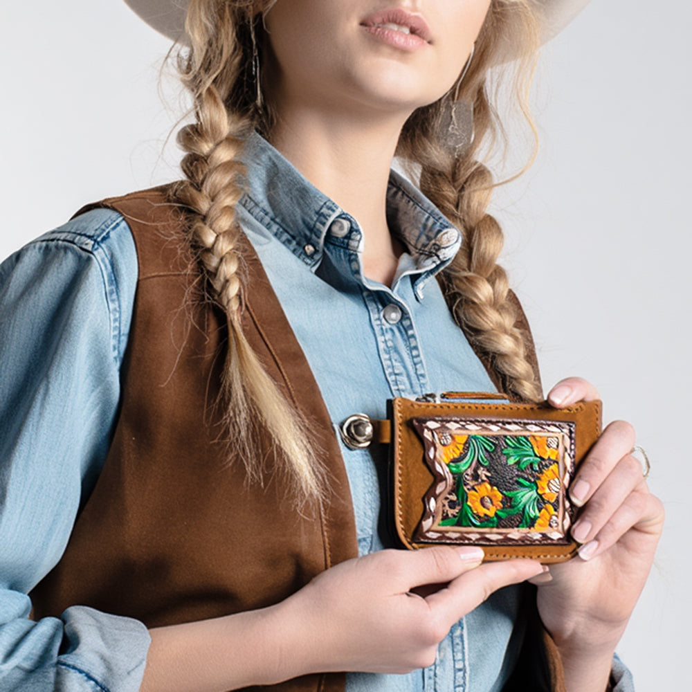 Add a splash of Western flair to your essentials with this compact tooled leather coin purse. Crafted from rich genuine leather, it features a hand-tooled floral design, framed by bold whipstitch detailing. The secure zip closure keeps your coins, keys, or small accessories safe, while the antique bronze clip easily attaches to your bag or belt loop for added convenience. A perfect Western-inspired accessory for everyday use or gifting.