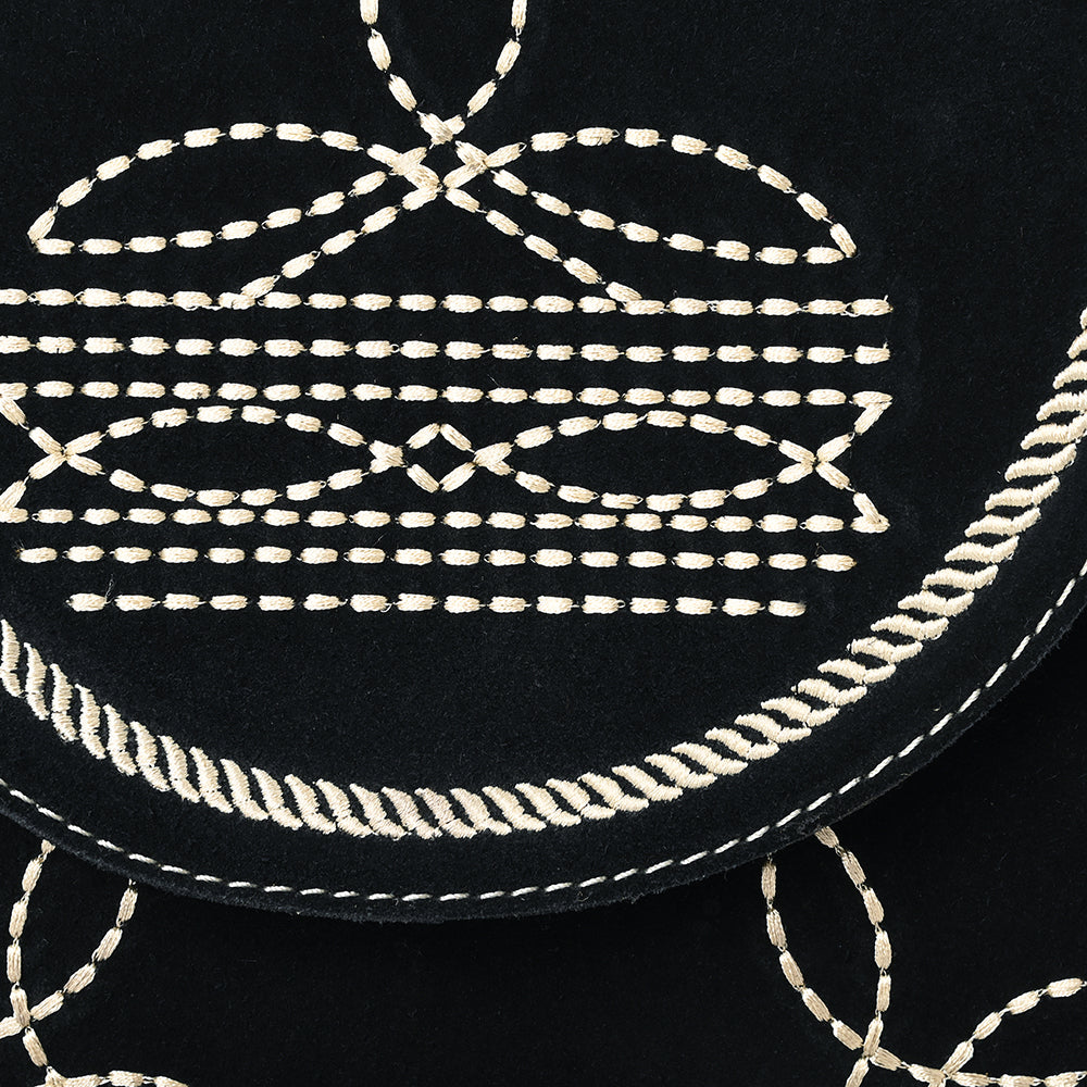 Carry Western charm wherever you go with this vertically structured crossbody bag, featuring intricate cream rope-style embroidery. The flap is decorated with a classic Western motif, framed by curved rope edging, while the lower panel showcases elegant floral stitch patterns.