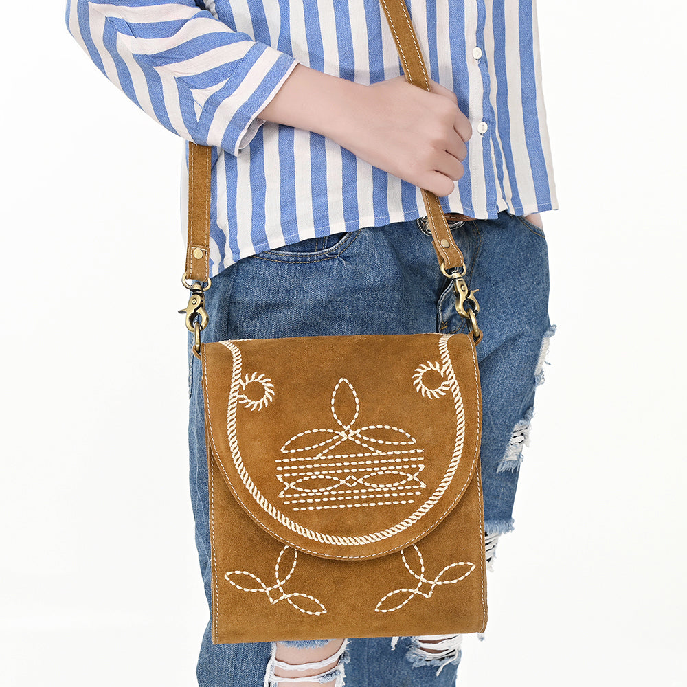 Made from Genuine suede-style material and fitted with a strap and antique brass hardware, this bag is perfect for daily wear, rodeos, or Western-themed events where style and practicality go hand-in-hand.
