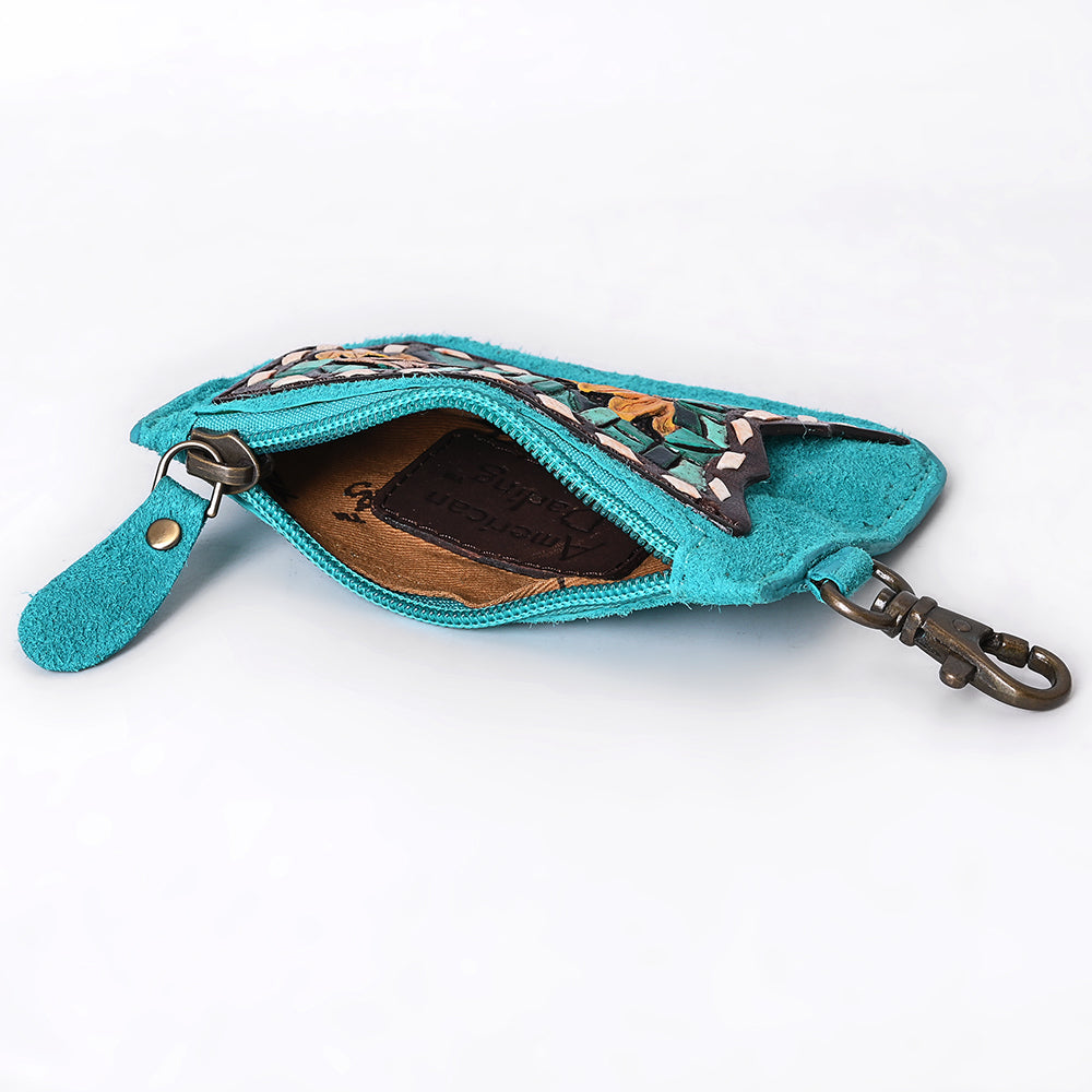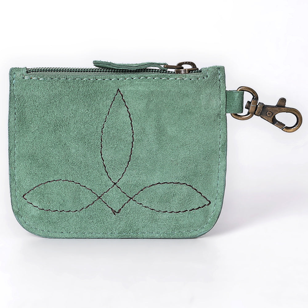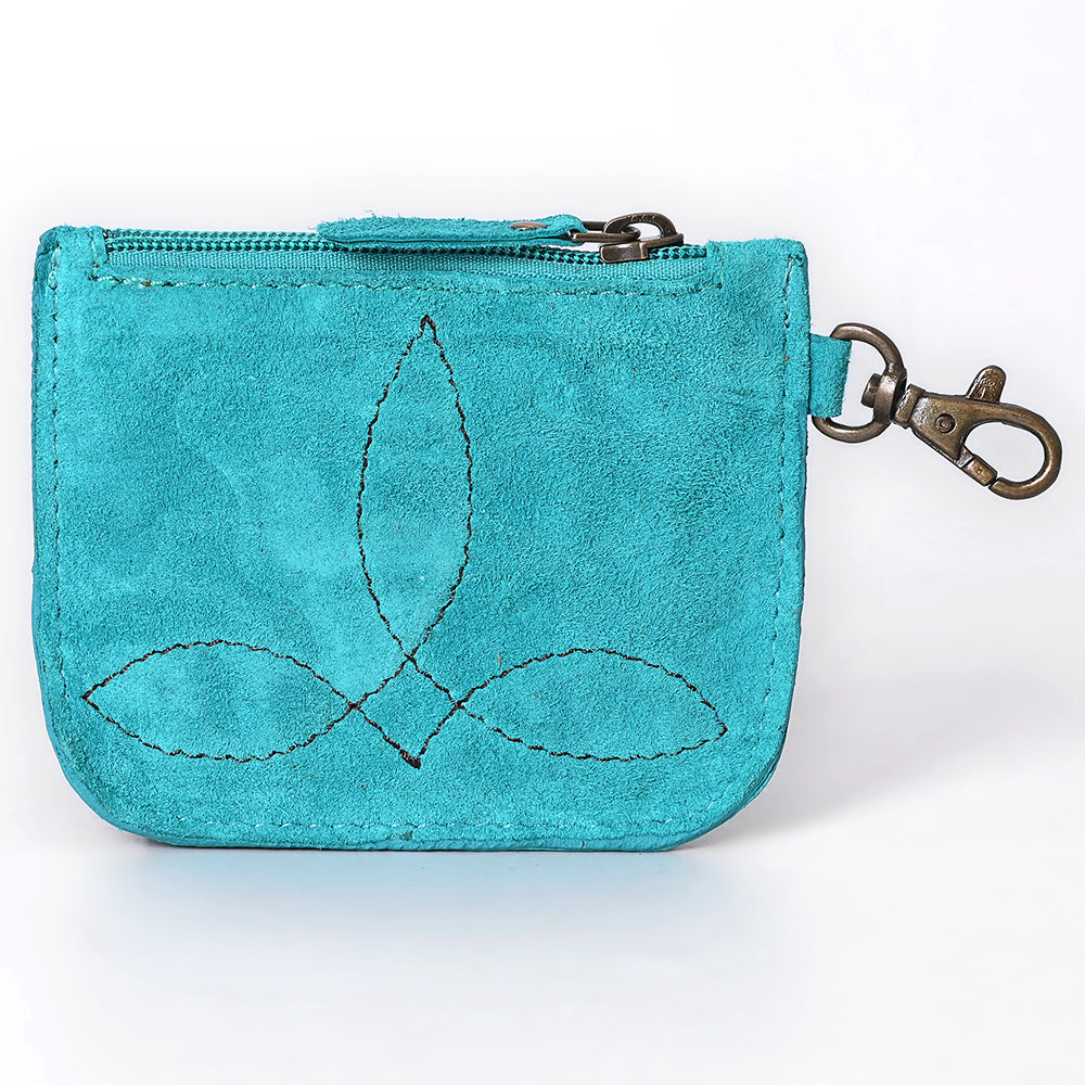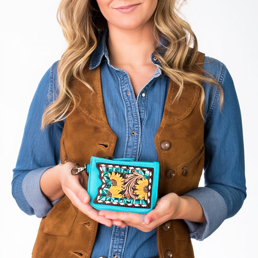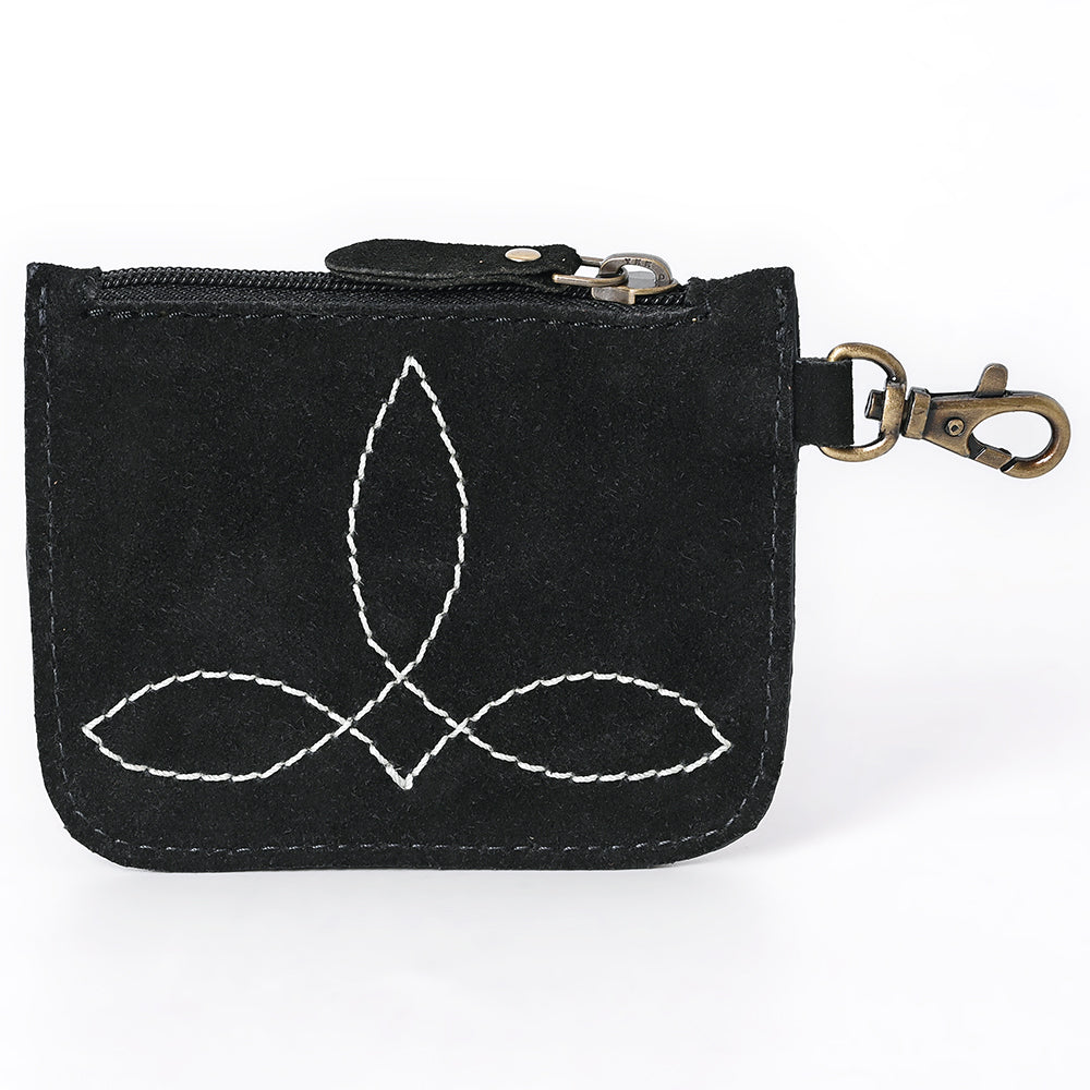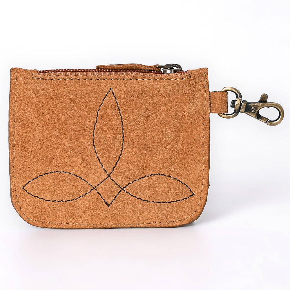 Carry a piece of Western artistry wherever you go with this compact hand-tooled leather coin purse. Featuring intricate scrollwork in a classic floral pattern, this mini pouch is crafted from genuine leather with a rich tan finish and bold black background. The secure zip-top closure keeps your coins and small essentials safe, while the metal swivel clasp allows for easy attachment to bags, belt loops, or keyrings. It’s the perfect everyday accessory for cowgirls, rodeo lovers, and Western fashion enthusiasts.