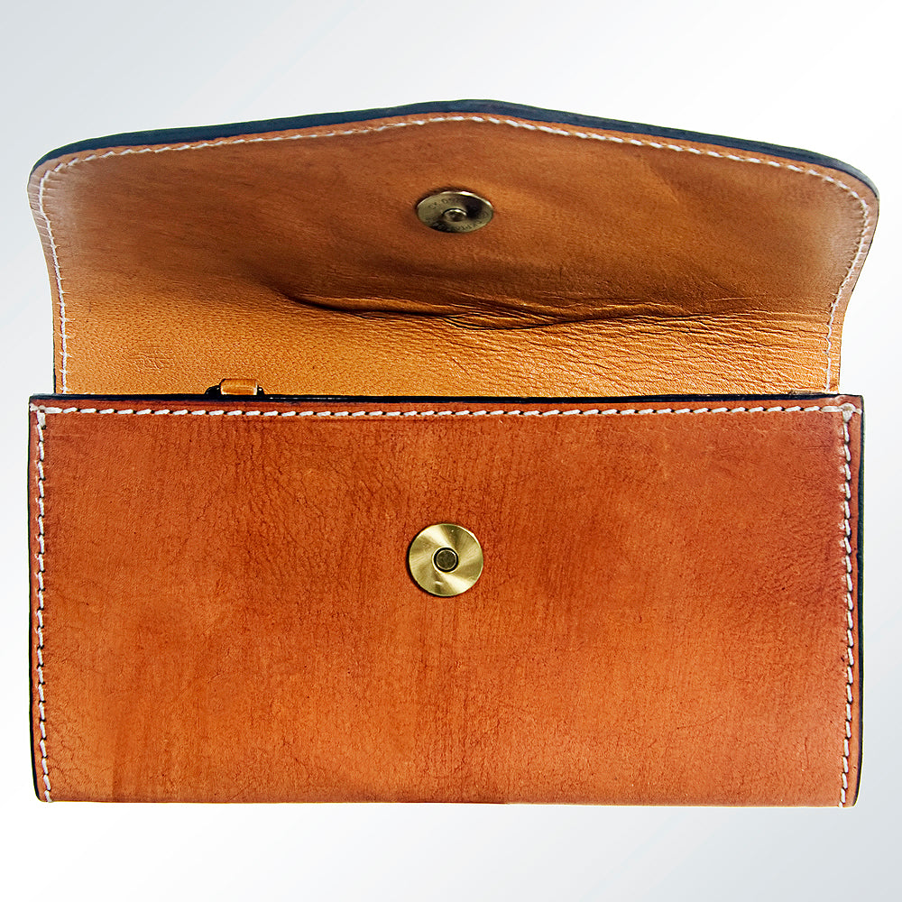This handcrafted Western wallet is a perfect blend of rugged elegance and traditional artistry. Made from premium full-grain leather, it features hand-tooled floral scrollwork and a striking center turquoise stone inlay that adds a bold pop of Southwestern style. Compact yet functional, this wallet is designed for daily use and complements any cowgirl's collection of Western accessories.