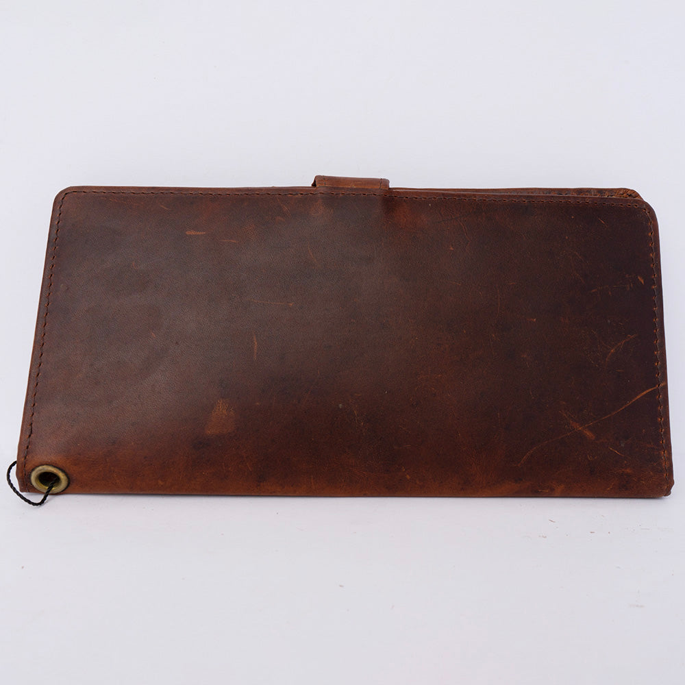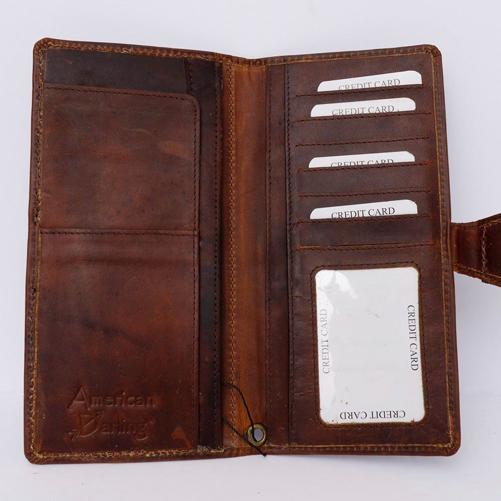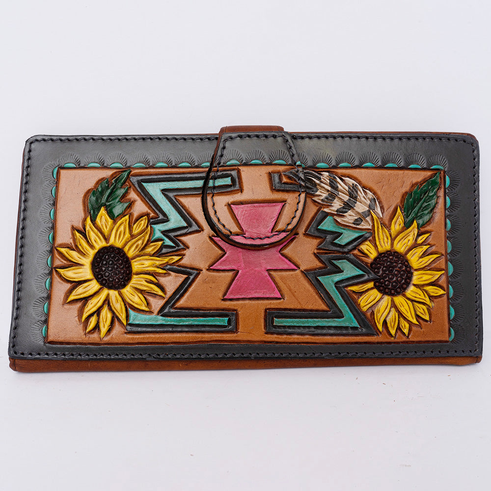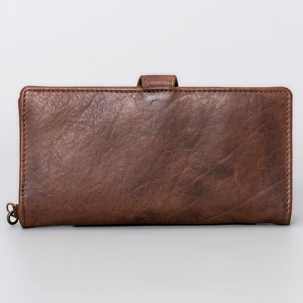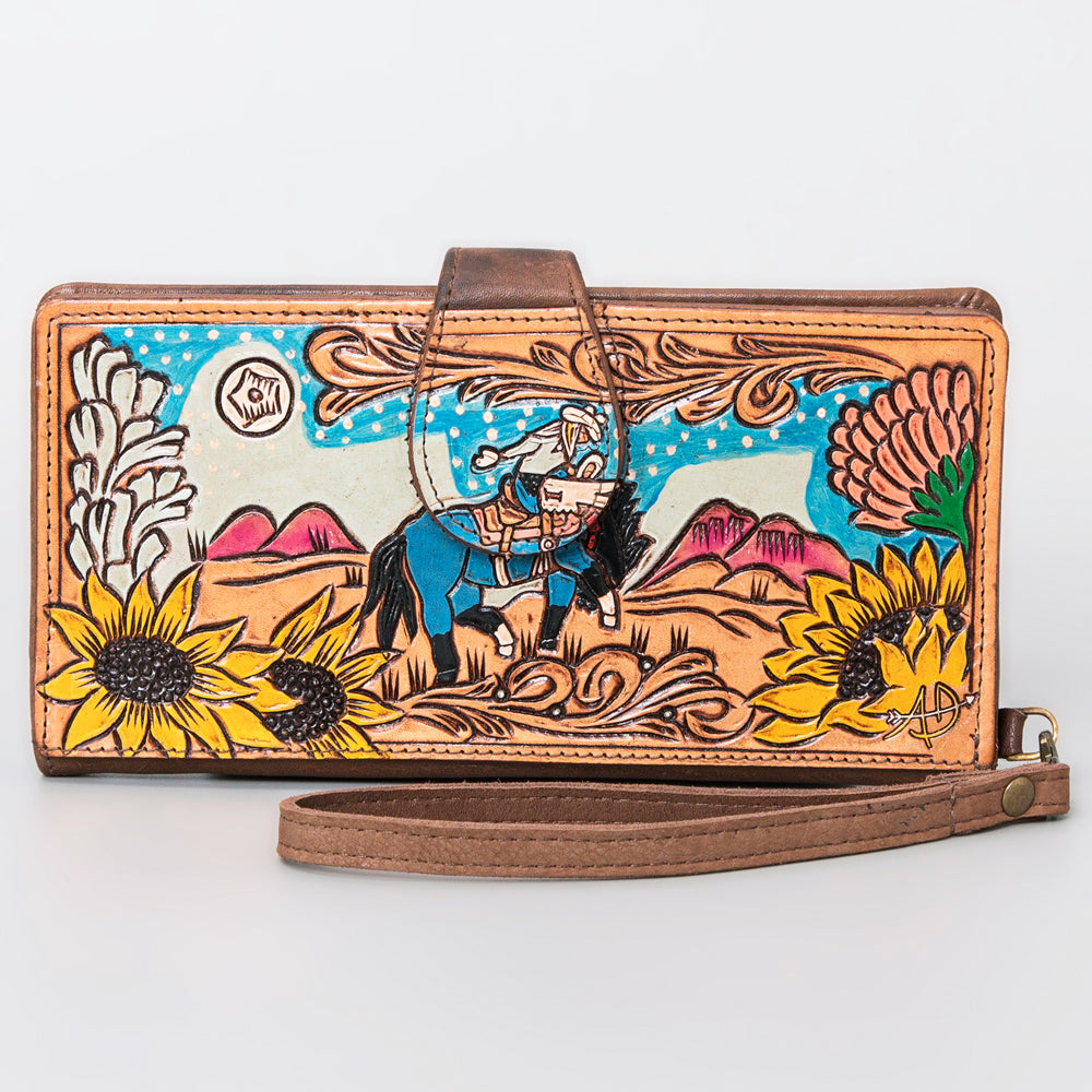 This handcrafted leather wallet features detailed tooling and a vibrant Western-themed design, showcasing artisan craftsmanship. Built for everyday use, it offers multiple card slots, a secure zip-around closure, and a detachable wristlet strap for convenient carrying.