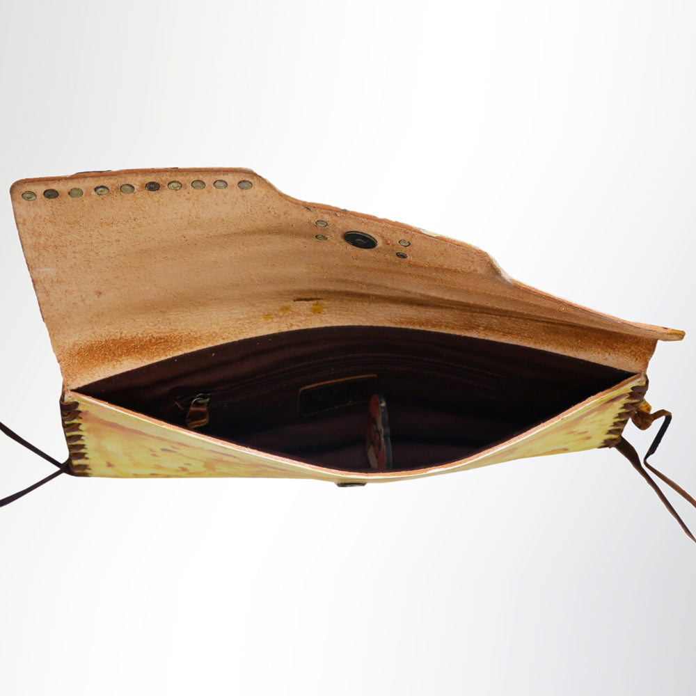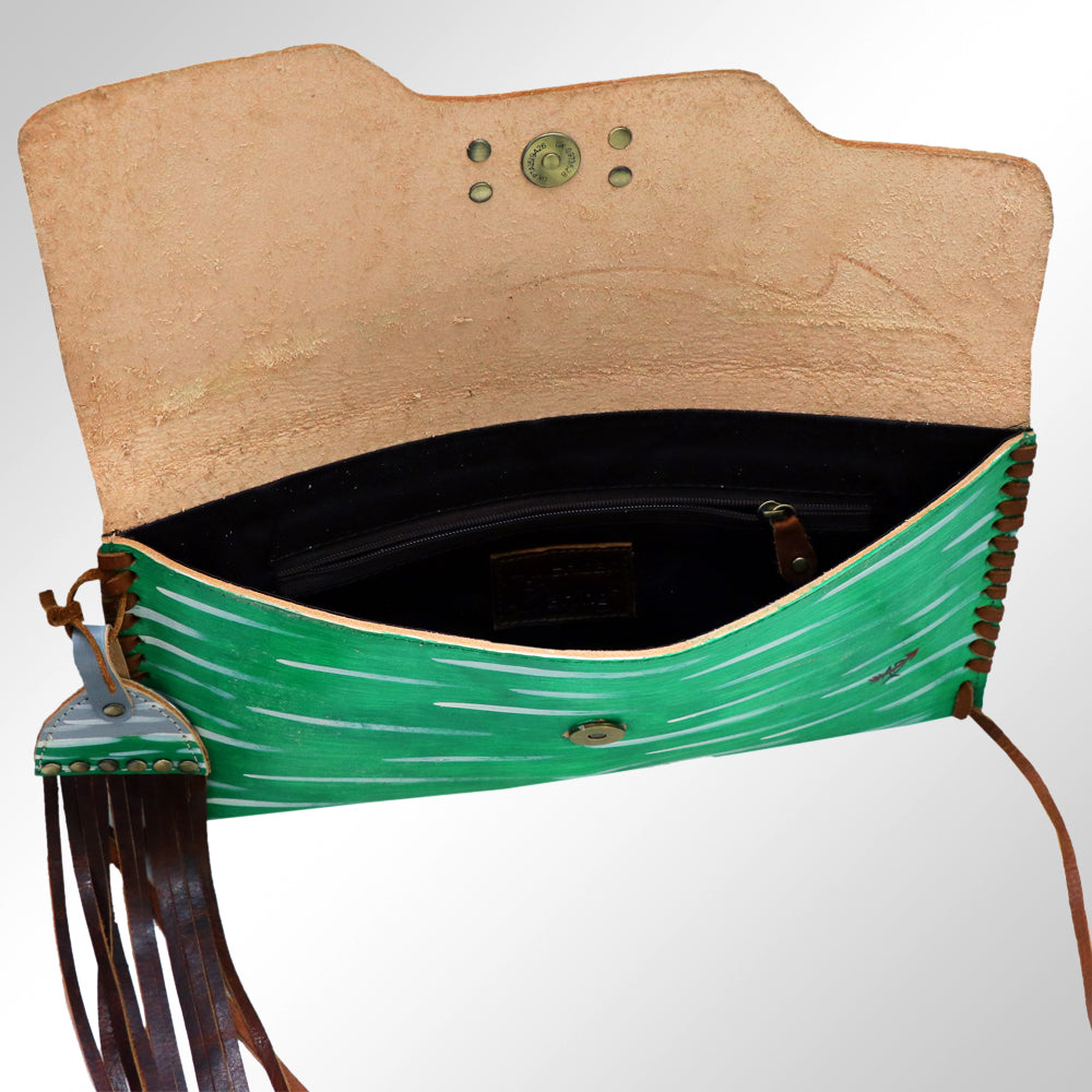 Celebrate bold Western spirit with this handcrafted Cowgirl-themed leather clutch featuring a hand-painted scene inspired by classic desert landscapes. Designed for the modern cowgirl, this genuine leather piece showcases vivid hand artwork, a studded leather side flap, and rustic fringe details that swing with every step.