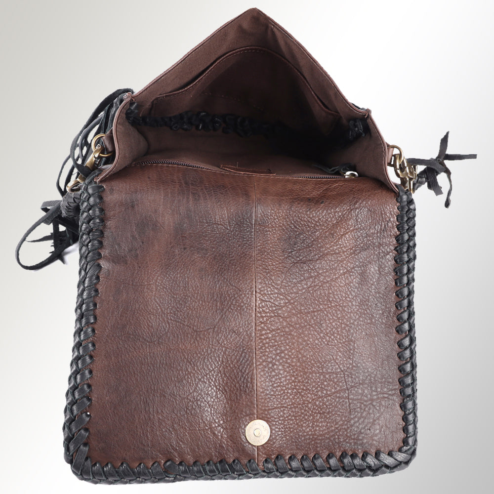 Make a bold Western statement with this handcrafted leather crossbody bag, featuring a rich dark finish with braided leather accents. The front flap is adorned with an oval turquoise stone concho, creating a rugged yet refined focal point that honors Southwest heritage.