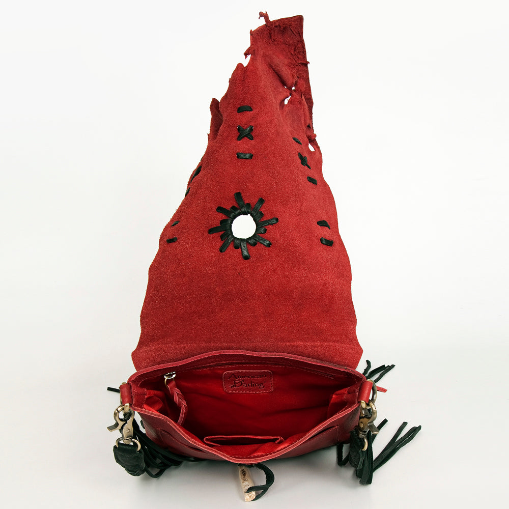 ADBGM282 Raw-Edge Tribal Leather Crossbody - Fringe, Bone Accent & Braided Strap