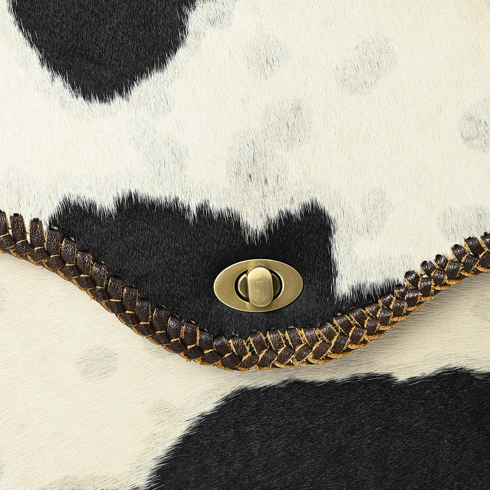 Where rustic style meets professional function—this black and white hair-on cowhide messenger bag is designed for the modern Western woman. With its structured silhouette, top handle, and secure turn-lock closure, this piece is perfect for work, school, or travel. The bold cowhide pattern makes a statement, while the hand-laced leather edges and adjustable strap keep things rugged yet refined.