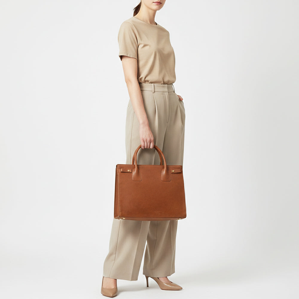 Timeless and refined, this structured brown leather tote is crafted for everyday functionality with Western-inspired craftsmanship. The clean silhouette, reinforced handles, and subtle gold-tone rivet accents make it a polished piece for work, travel, or daily errands. Made from high-quality full-grain leather, this bag is built to last and elevate your Western wardrobe with quiet sophistication.