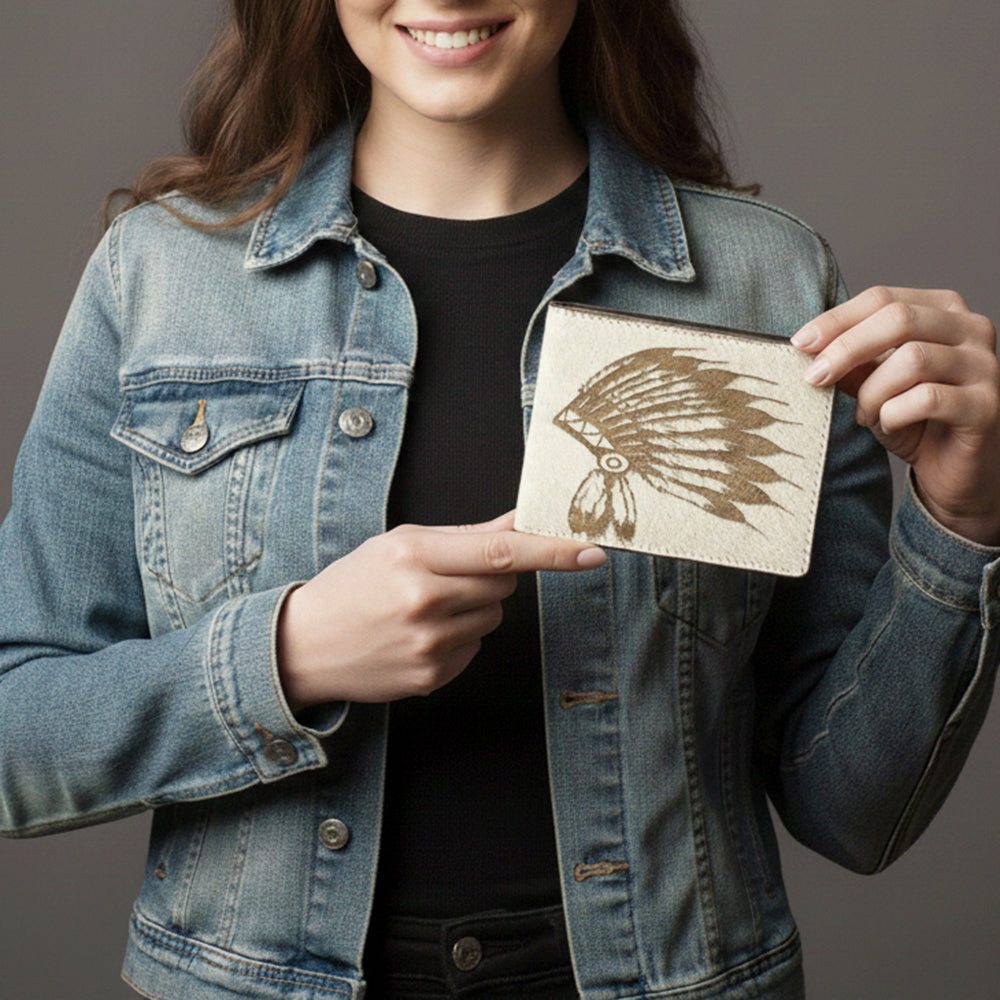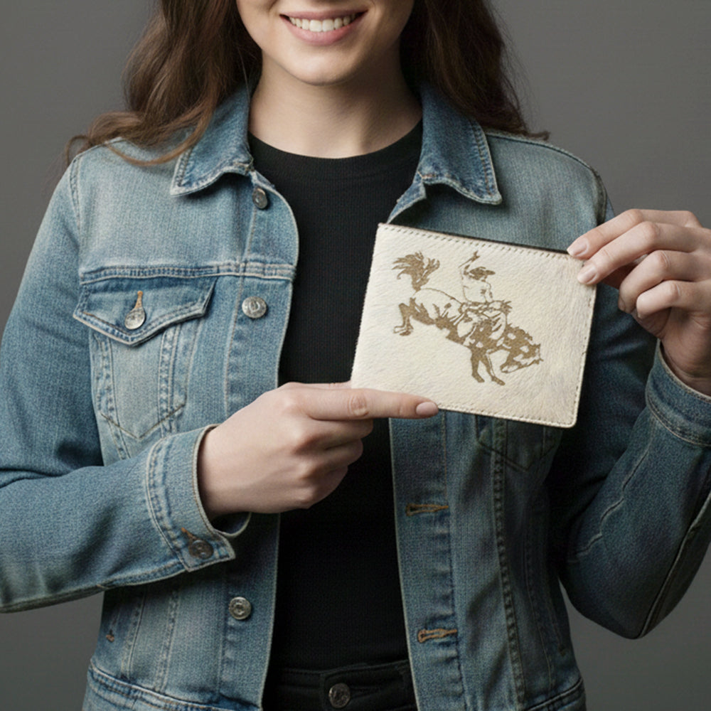 Capture the fearless energy of the rodeo with this premium hair-on leather bi-fold wallet. Crafted from genuine cowhide, the front features a laser-etched design.