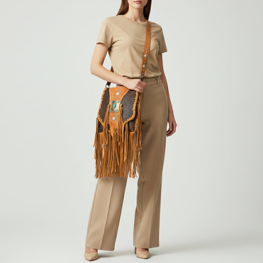 Make a fearless fashion statement with this handcrafted Western fringe Messenger bag. Designed with a soft scalloped flap front and detailed with silver concho studs, this piece is finished with a bold turquoise centerpiece medallion for classic cowgirl energy.