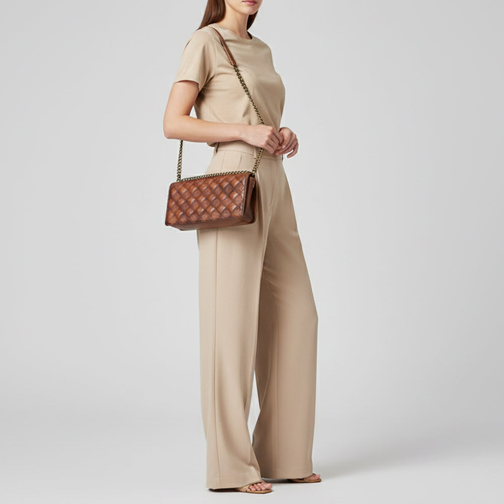 Elevate your Western chic look with this quilted genuine leather organiser bag. With its luxurious diamond-stitched pattern and antique brass chain strap, this clutch combines rugged Western soul with uptown sophistication. The rich brown leather is soft yet structured, offering the perfect blend of style and durability.
