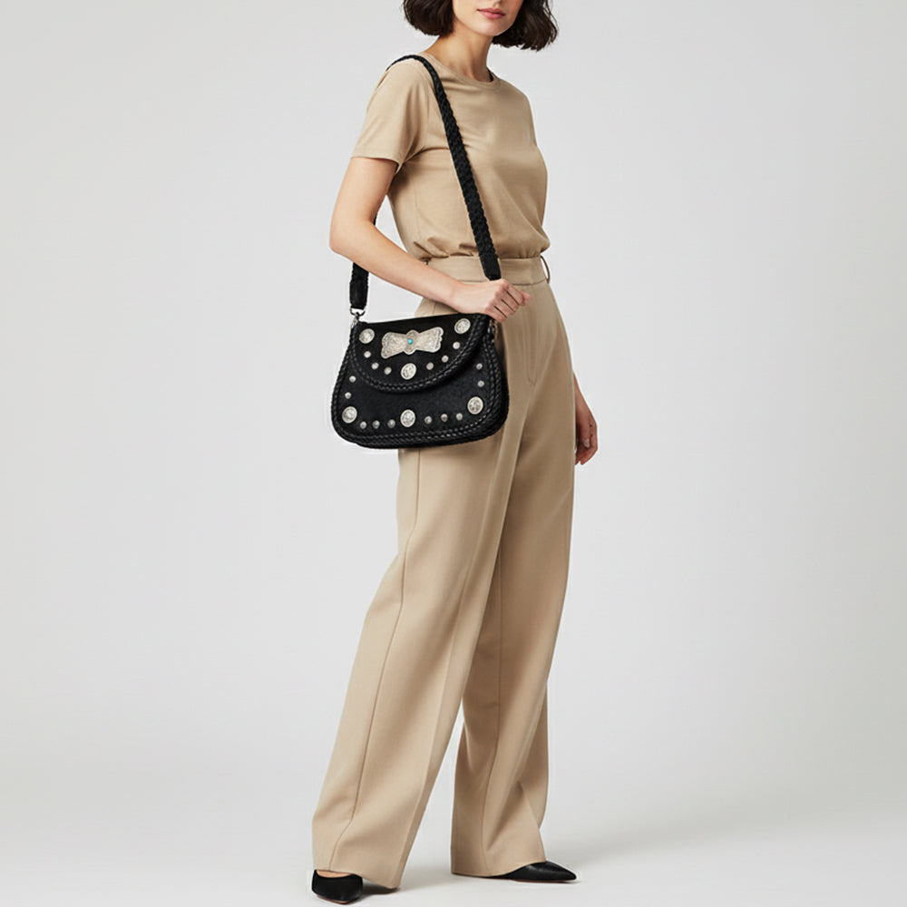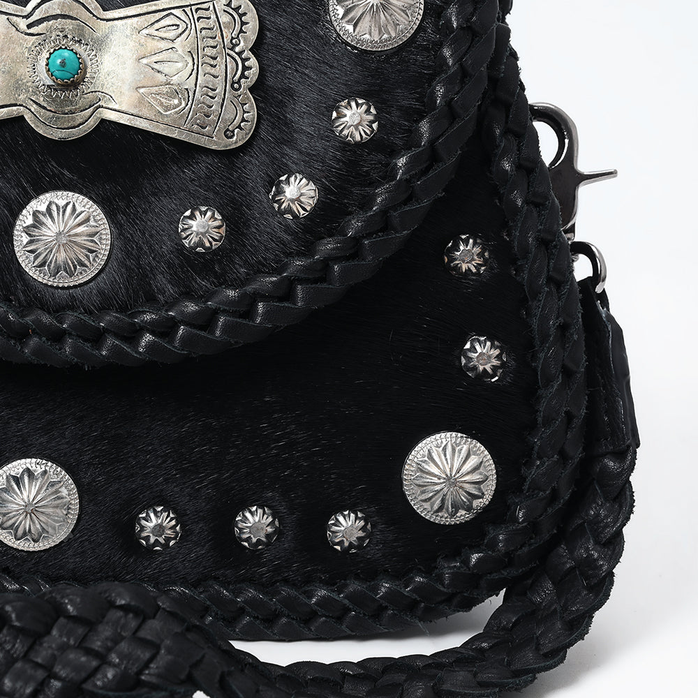 ADBGM521 Black Hair-On Leather Crossbody with Silver Conchos - Western Turquoise Accent Bag