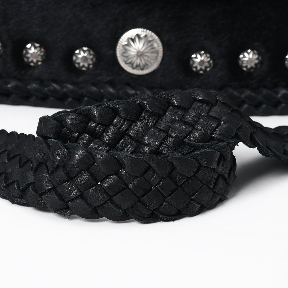 Make a statement with this stunning black hair-on leather crossbody, adorned with Western-style silver conchos and a bold turquoise-accented centerpiece. Hand-braided edges and a matching strap add a rugged, artisan touch, while the rich black cowhide delivers luxury and depth.