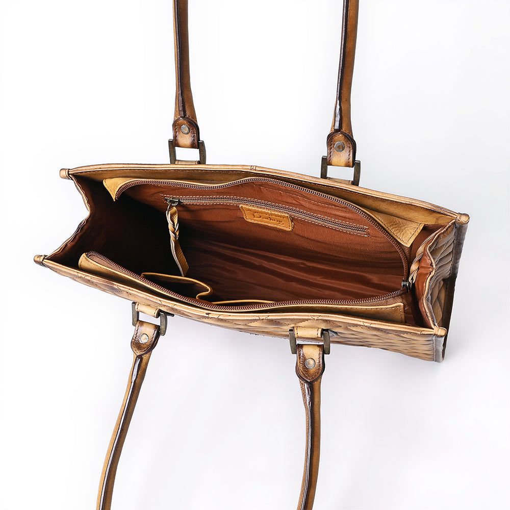 Step into the elegance of the West with this handcrafted quilted leather tote. Featuring a structured silhouette, rich tan leather, and a bold diamond-stitched center patch with Western embroidery, this bag blends rugged charm with refined craftsmanship.