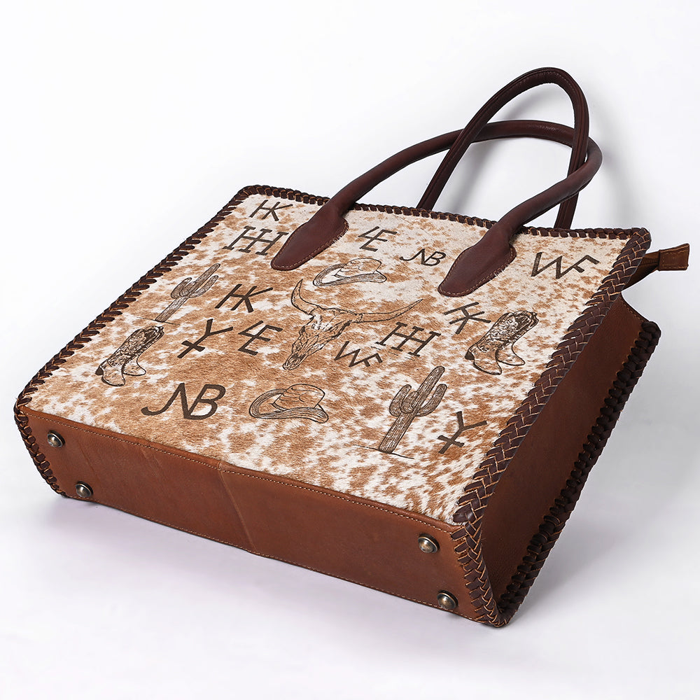 ADBGM601 Hair-On Hide Western Tote Bag with Ranch Brand Print and Tooled Leather Trim