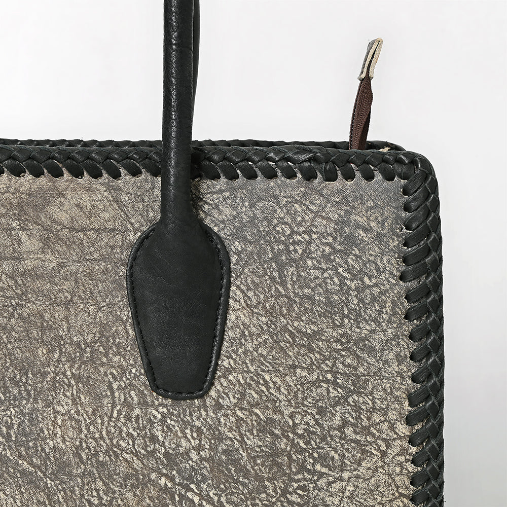 Elevate your Western wardrobe with this luxe distressed silver tote bag crafted from genuine leather. Featuring a metallic sheen and textured finish, this stylish tote is framed with bold black braided leather trim and paired with long, sturdy black leather handles for an elegant contrast.