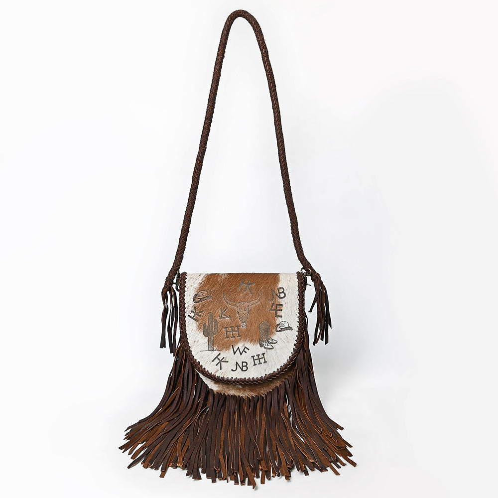 ADBGM669 Western Fringe Crossbody - Hair-On Leather with Cowboy Print & Braided Strap