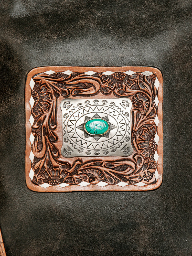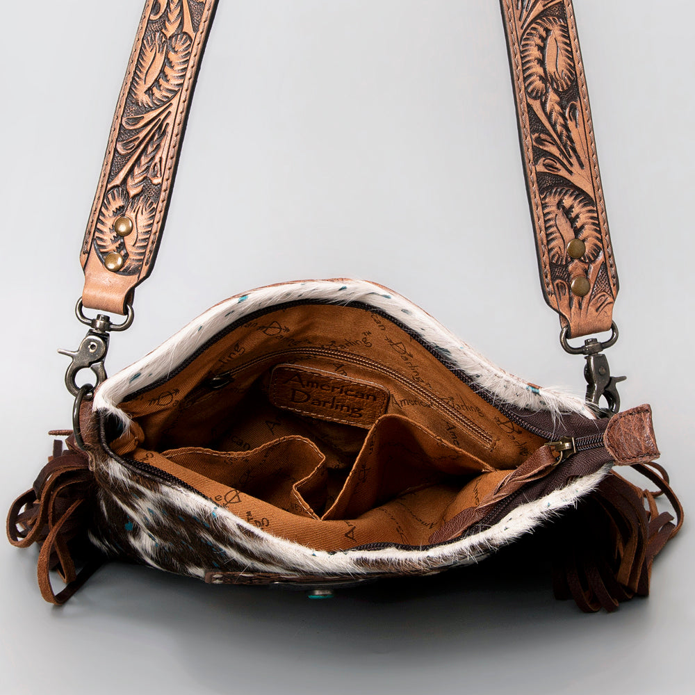ADBGS192 Cowhide Large Crossbody Bag with Tooled Patch, Fringe & Floral Strap - Western Hand Purse
