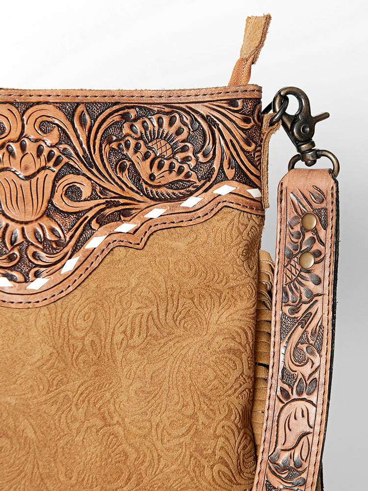 Timeless Western elegance meets artisan craftsmanship in this Floral Embossed Leather Crossbody Bag. Featuring rich embossed leather with a subtle floral pattern, this sleek and refined bag is adorned with a hand-tooled floral leather yoke and a matching tooled strap. The long black Genuine suede fringe adds graceful movement and a hint of wild Western spirit.