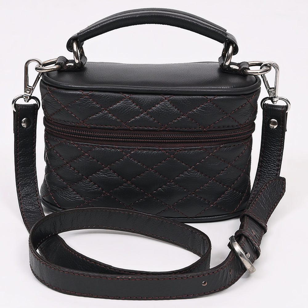 Sleek, stylish, and compact—this black quilted leather jewelry case is your ideal companion for elevated everyday style. Made from genuine leather, the diamond-stitched pattern and rich maroon thread detail add a subtle Western edge. Featuring a secure zip closure, sturdy top handle, and strap, this bag is perfect for both casual outings and classy evenings.