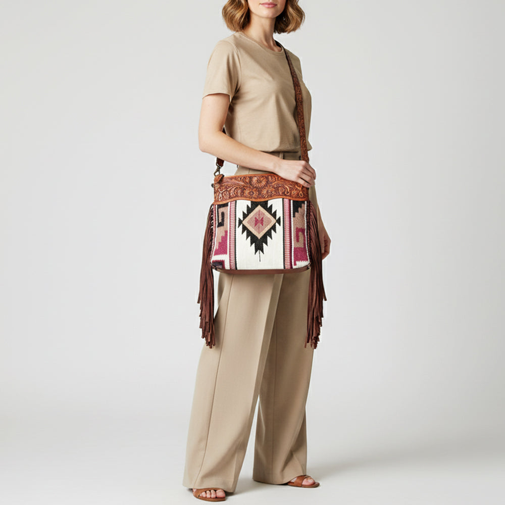Make a bold statement with this handcrafted Western crossbody bag, blending traditional Southwestern textiles with fine leather craftsmanship. Featuring a white base woven with deep wine, mauve, and black Navajo-style patterns, it’s accented with a tooled leather top panel and wide shoulder strap detailed in floral scrollwork.