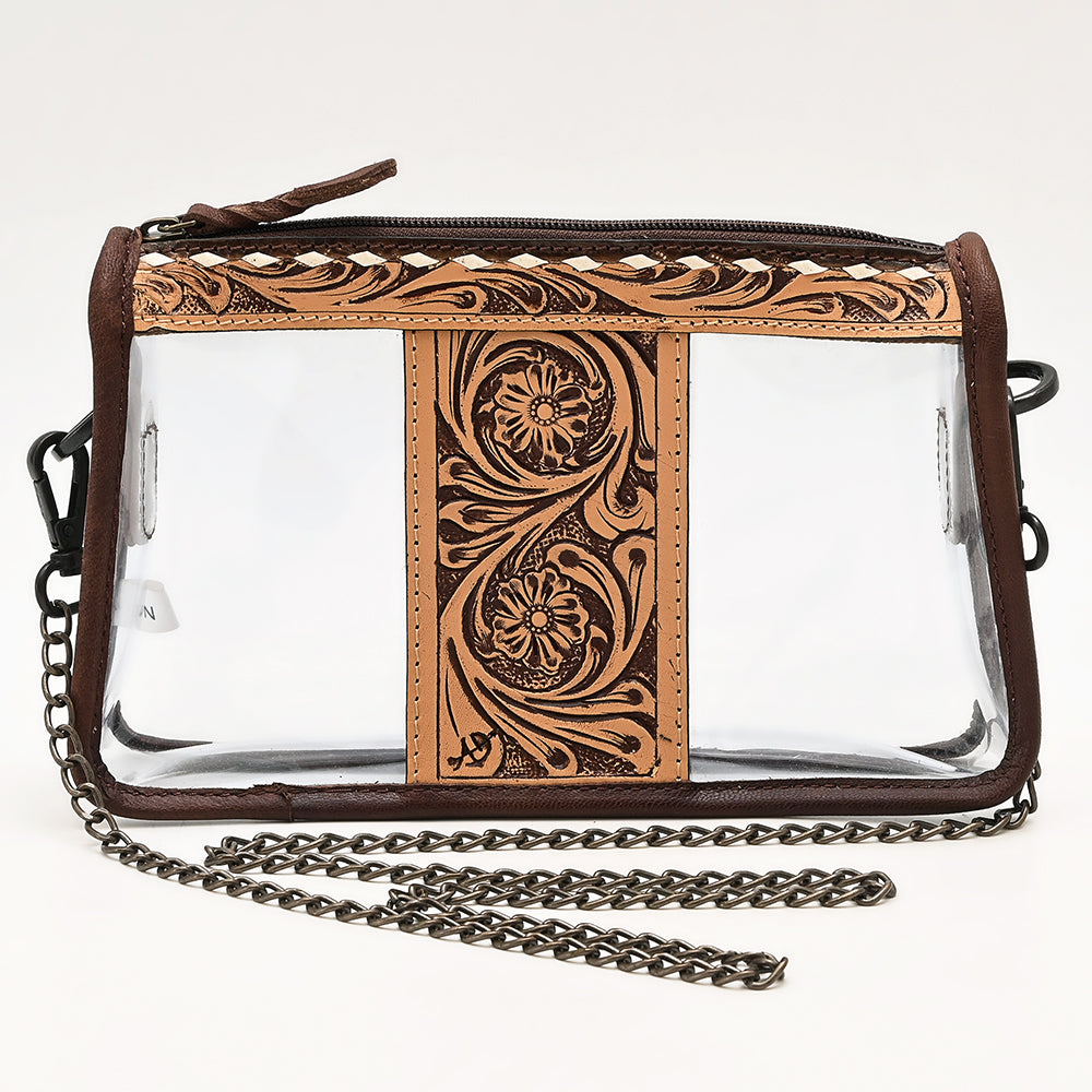 ADBGZ655 Clear Stadium Bag with Floral Tooled Leather Trim and Chain Strap - Western Crossbody