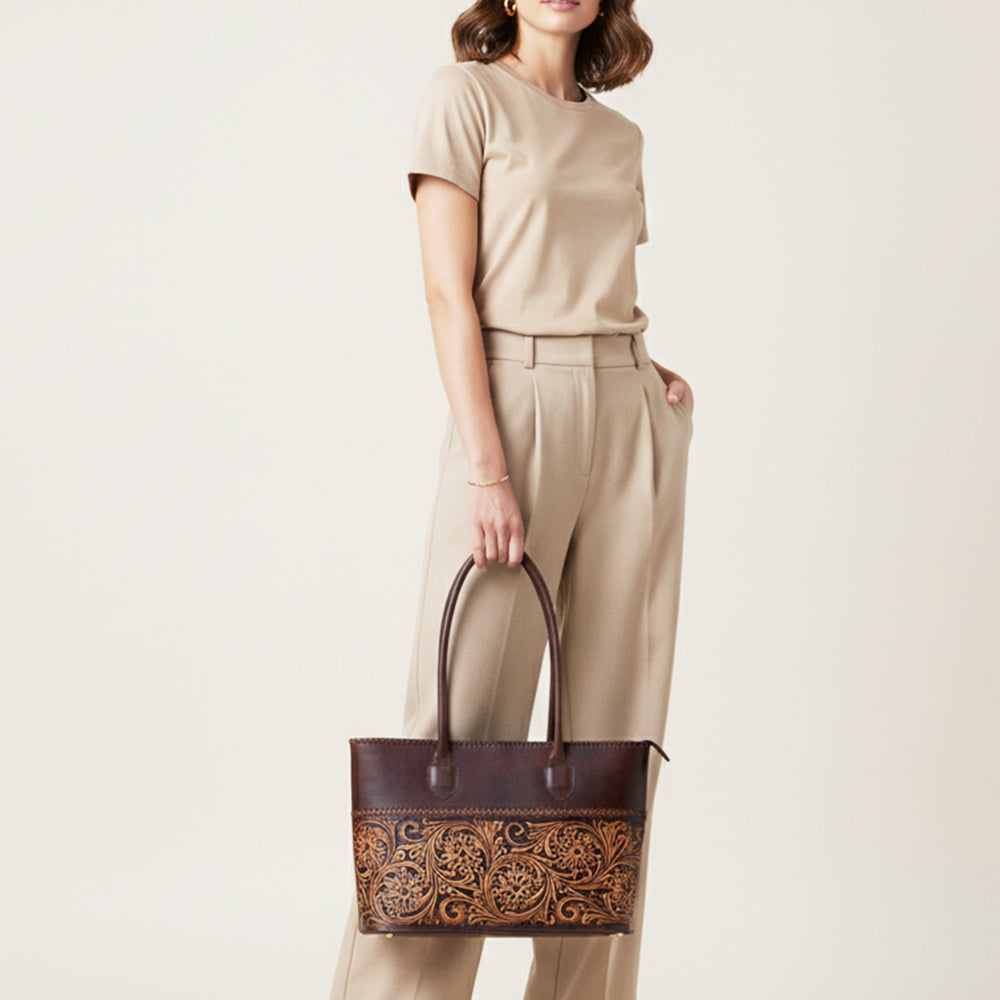 This tall Hand tote bag blends classic Western artistry with modern elegance. Featuring a smooth upper body and richly hand-tooled floral leather on the lower half, it offers the perfect balance of refined simplicity and bold detailing. The full-grain leather construction, dual reinforced handles, and zippered closure make this a practical everyday carry for the stylish cowgirl.