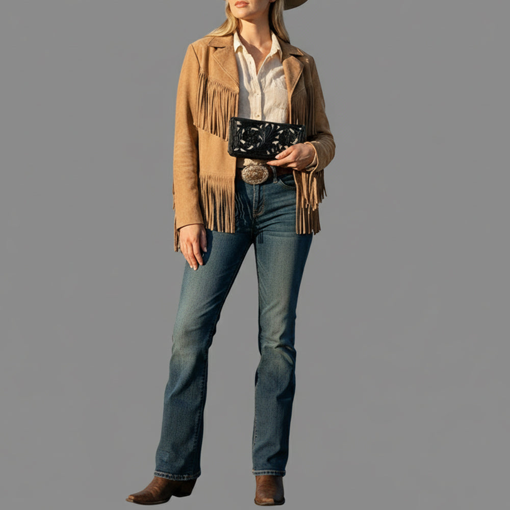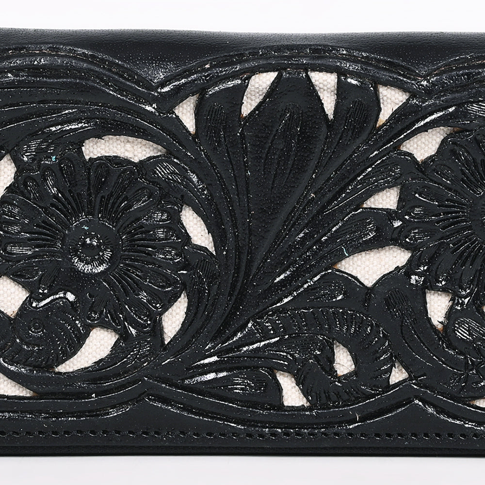 Classic Western craftsmanship meets striking contrast in this hand-tooled black leather wallet. Designed with deeply carved floral patterns over a light cream inlay, it brings a bold, high-end touch to everyday function. Crafted from genuine leather, this zip-around wallet is both secure and stylish—ideal as a statement piece or matched with your favorite black Western tote or handbag.