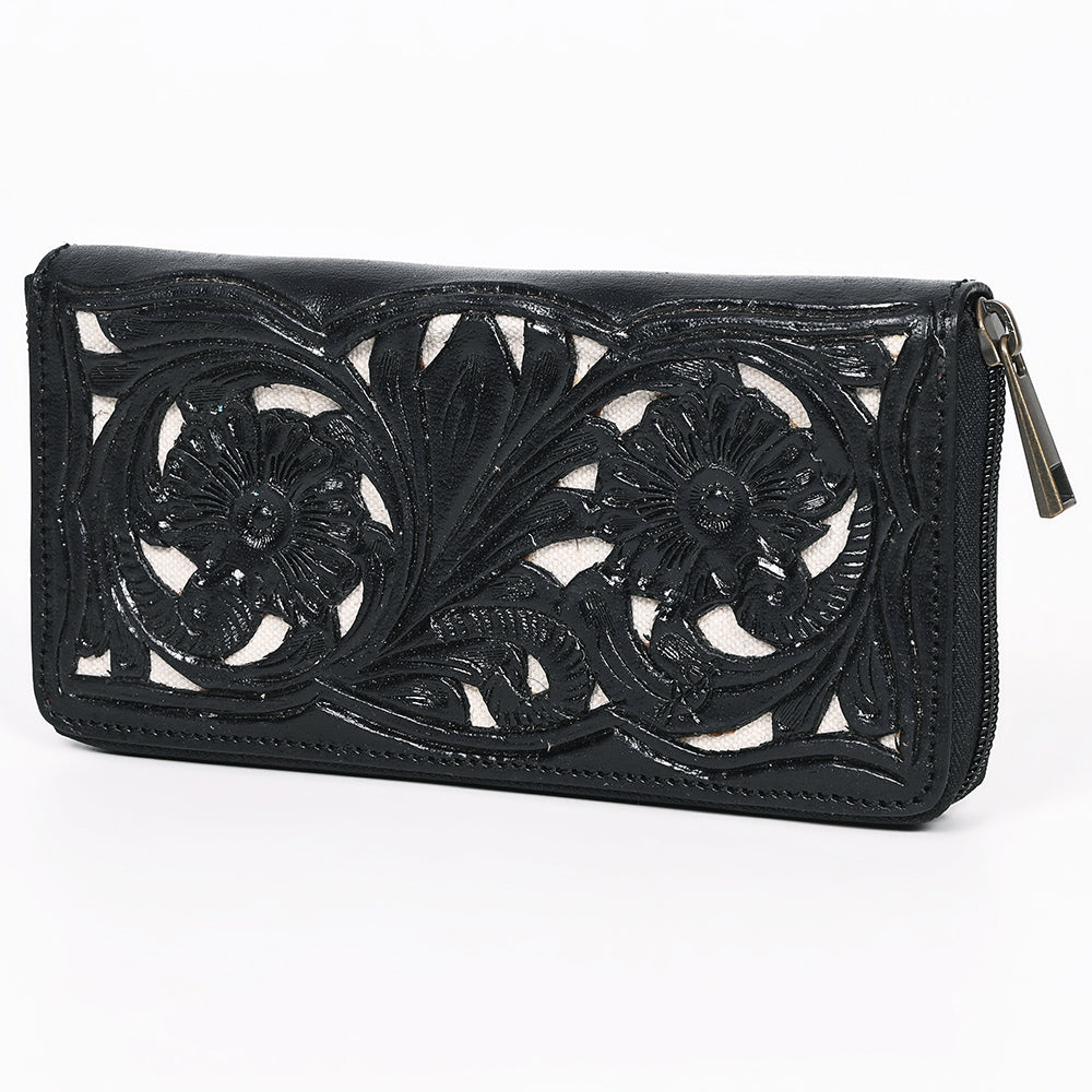 ADBGZ810A Black Hand-Tooled Leather Wallet - Western Floral Zip Wallet with Cream Contrast