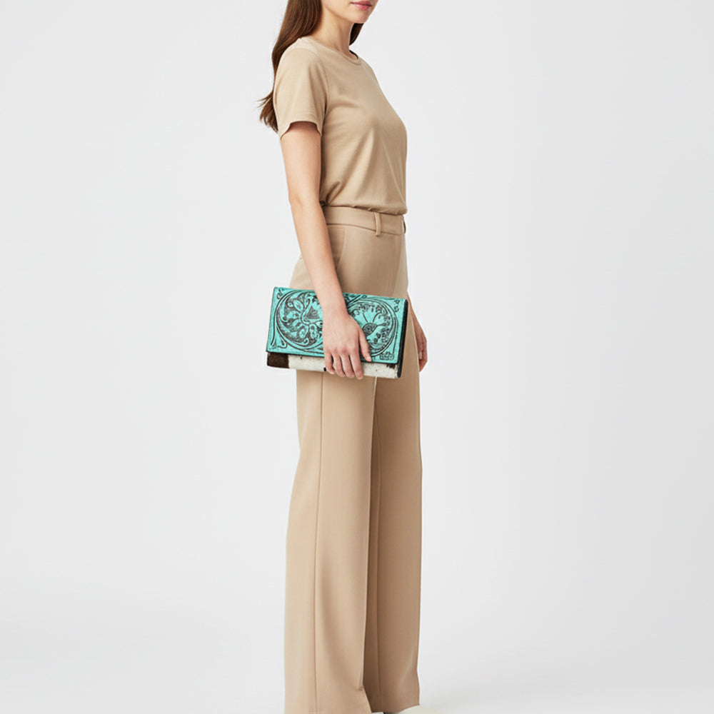 Elevate your everyday essentials with this exquisite wallet from American Darling. Handcrafted from genuine leather and accented with authentic hair-on cowhide, the front showcases a stunning floral tooling design that captures the heart of Western heritage.