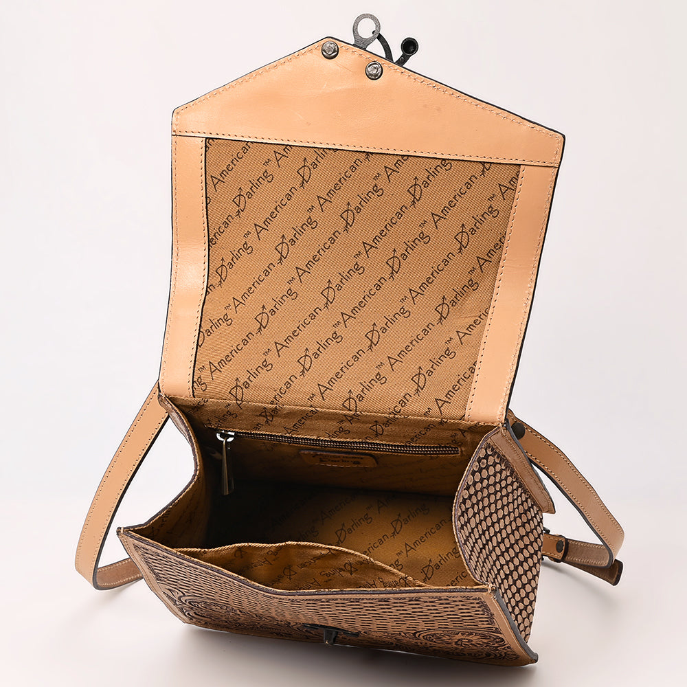 Make a bold statement with this structured, tooled leather handbag from American Darling. Crafted from premium vegetable-tanned leather and hand-tooled with an intricate floral and basketweave design, this satchel-style bag features a sturdy top handle and adjustable shoulder strap. Whether carried by hand or worn crossbody, this timeless Western piece blends elegance with practicality.