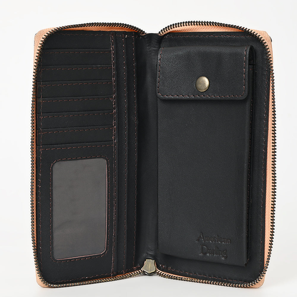 Elevate your everyday essentials with this handcrafted tan leather clutch from American Darling. Featuring deeply carved floral tooling and a secure zip-around closure, this Western-style clutch blends artisan charm with practical organization. A beautiful addition to any handbag or perfect to carry solo.