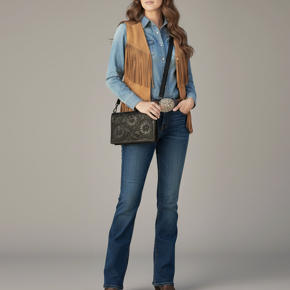 Compact, elegant, and Western to the core, this black tooled leather wallet crossbody from American Darling is a versatile statement piece. Handcrafted from genuine leather and beautifully hand-tooled with floral motifs, it’s perfect for both everyday carry and dressed-up events. Wear it as a crossbody or remove the strap for a stylish wristlet clutch.