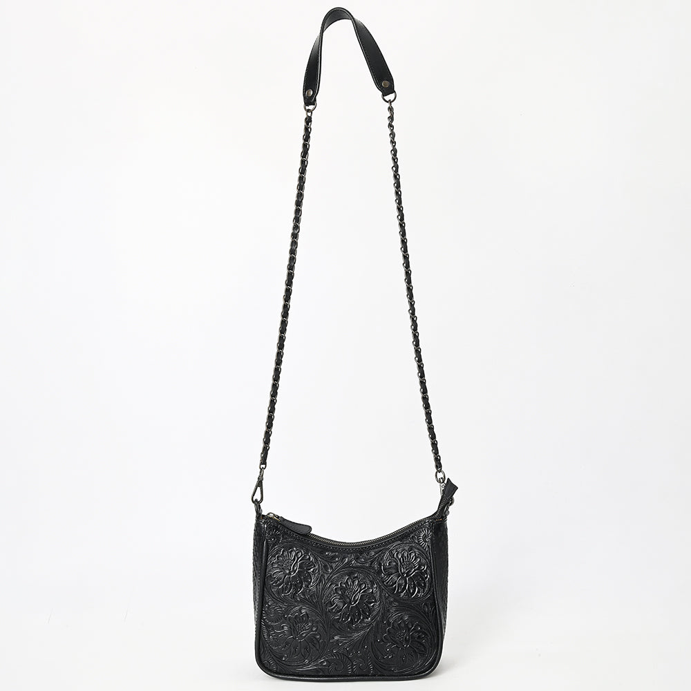 ADBGZ904A Black Hand-Tooled Genuine Leather Curved Messenger Bag with Chain Strap