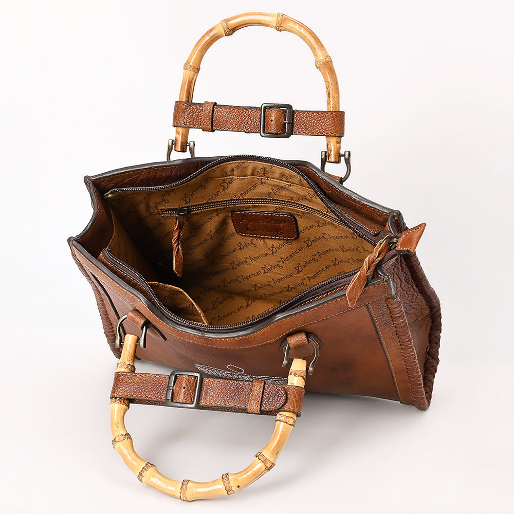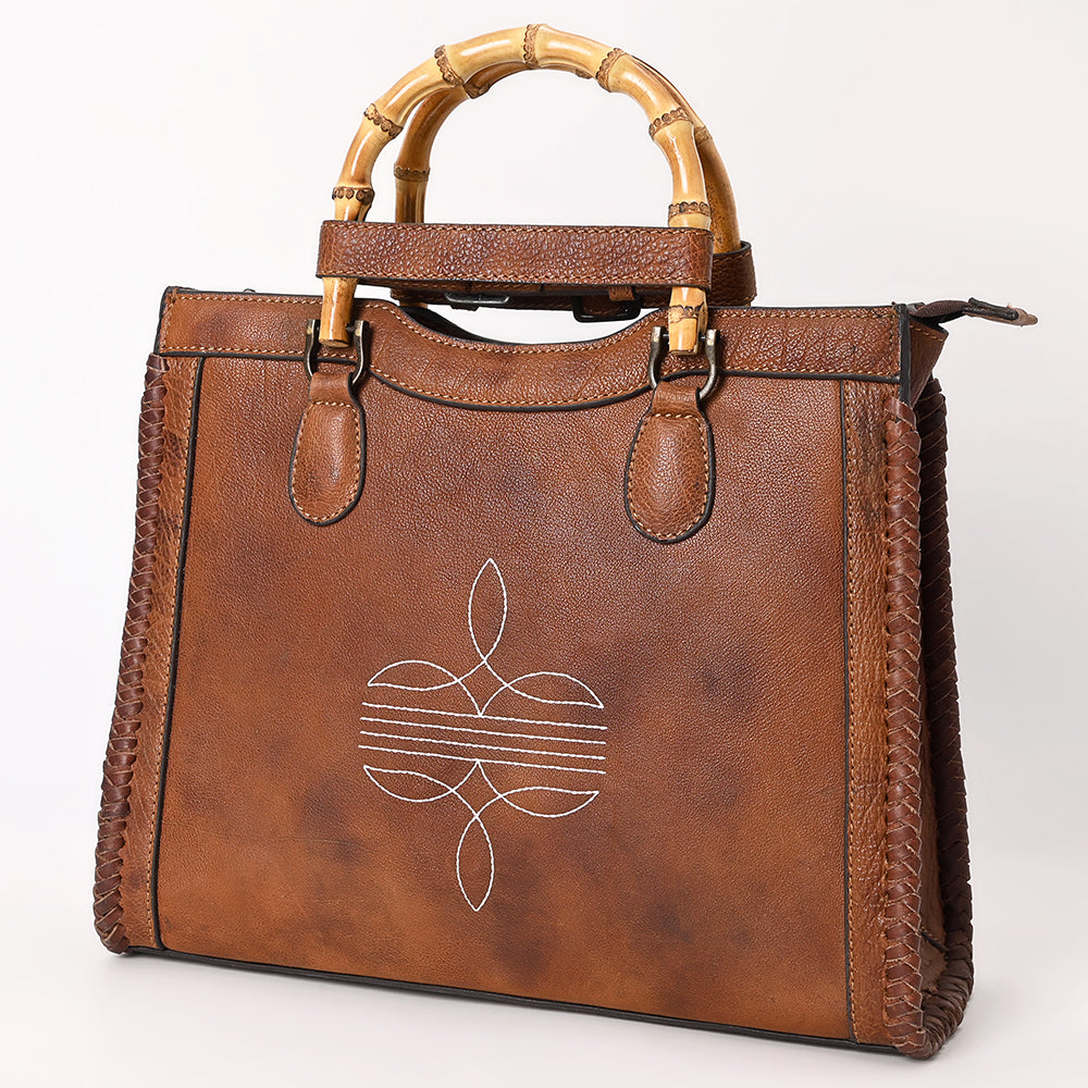 ADBGZ911 Vintage Brown Genuine Leather Tote Bag with Bamboo Handles and White Stitch Detail