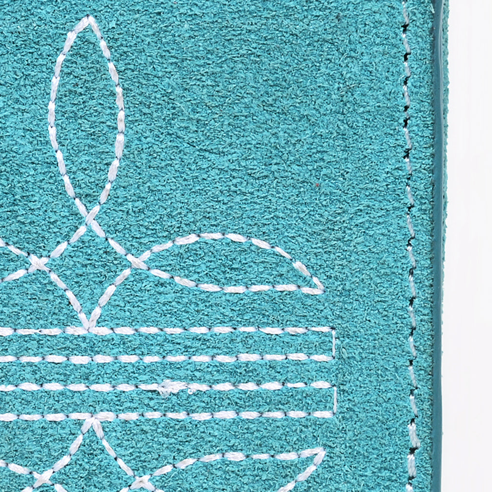 Crafted for timeless Western style, this Genuine suede trifold wallet offers rustic charm and practical design. Made from genuine leather with a soft Genuine suede finish, it features a prominent white embroidered Western stitch on the front flap. Its vertical trifold layout provides maximum storage space while maintaining a sleek silhouette—perfect for everyday use or gifting.