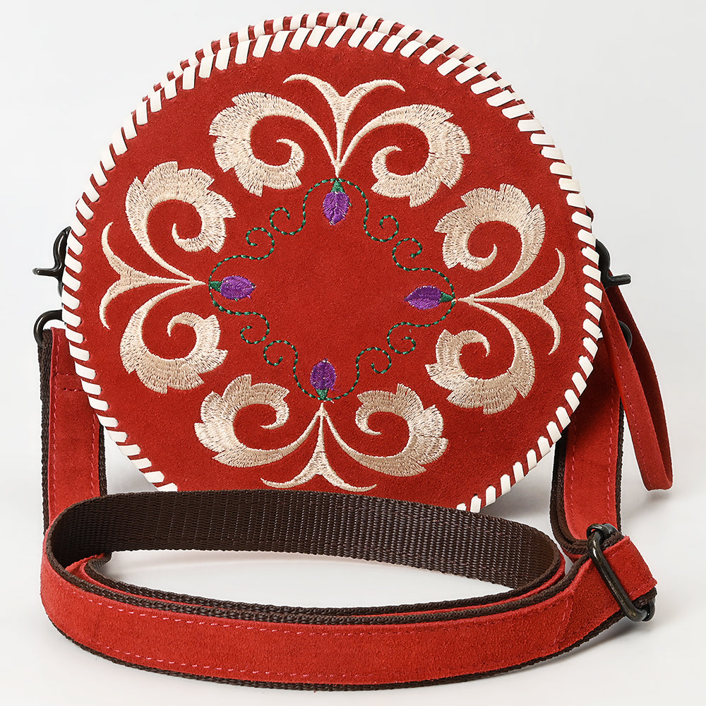 ADBGZX101B Round Red Genuine suede Embroidered Canteen Bag with Floral Design & Whipstitch Trim