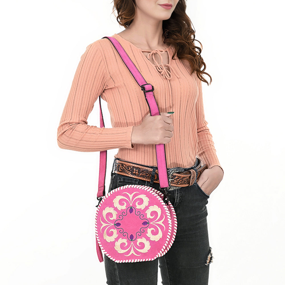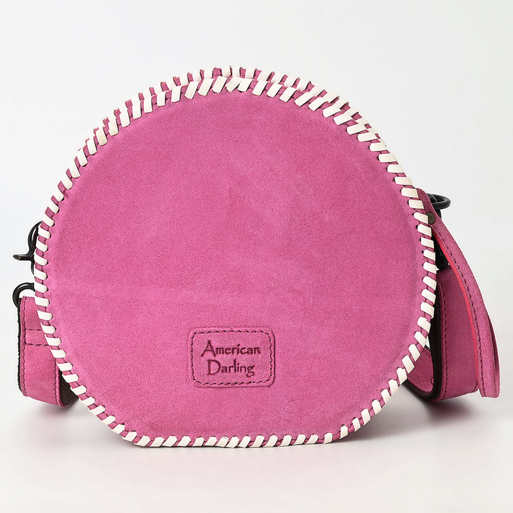 Brighten up your style with this playful round pink Genuine suede canteen bag, featuring stunning ivory floral embroidery and rich purple accents. The handcrafted white whipstitch trim and classic Western charm make this a standout piece for both everyday wear and special occasions.