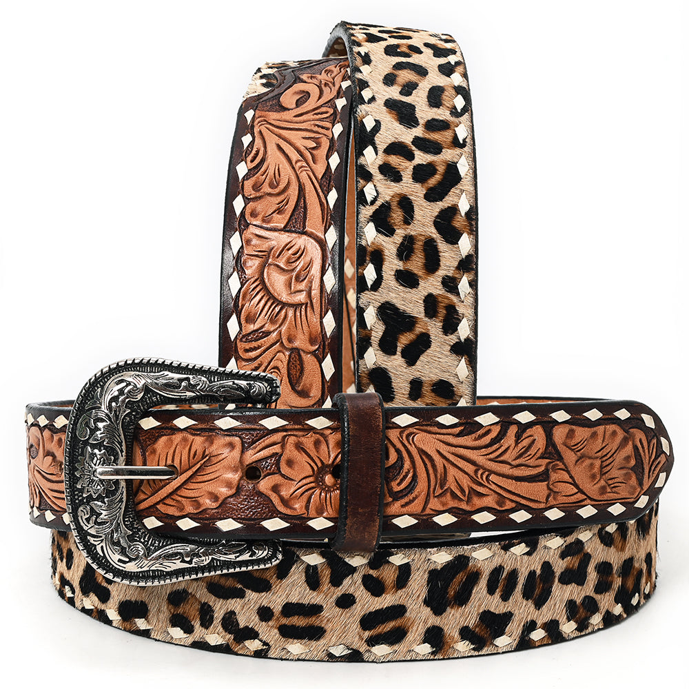 ADBLF227 Leopard Print Hair-On & Tooled Leather Western Belt with Engraved Buckle