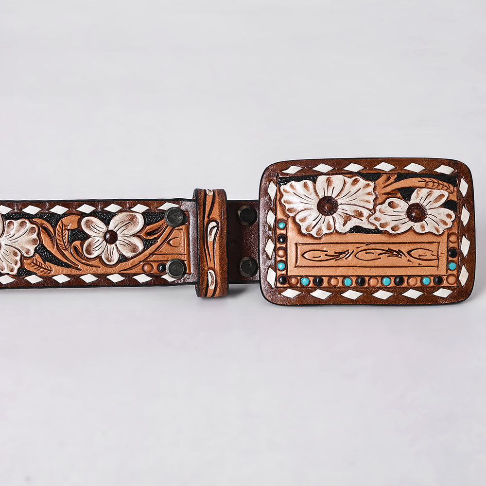 ADBLF287 Hand-Tooled Leather Western Belt - White Floral with Turquoise Studs