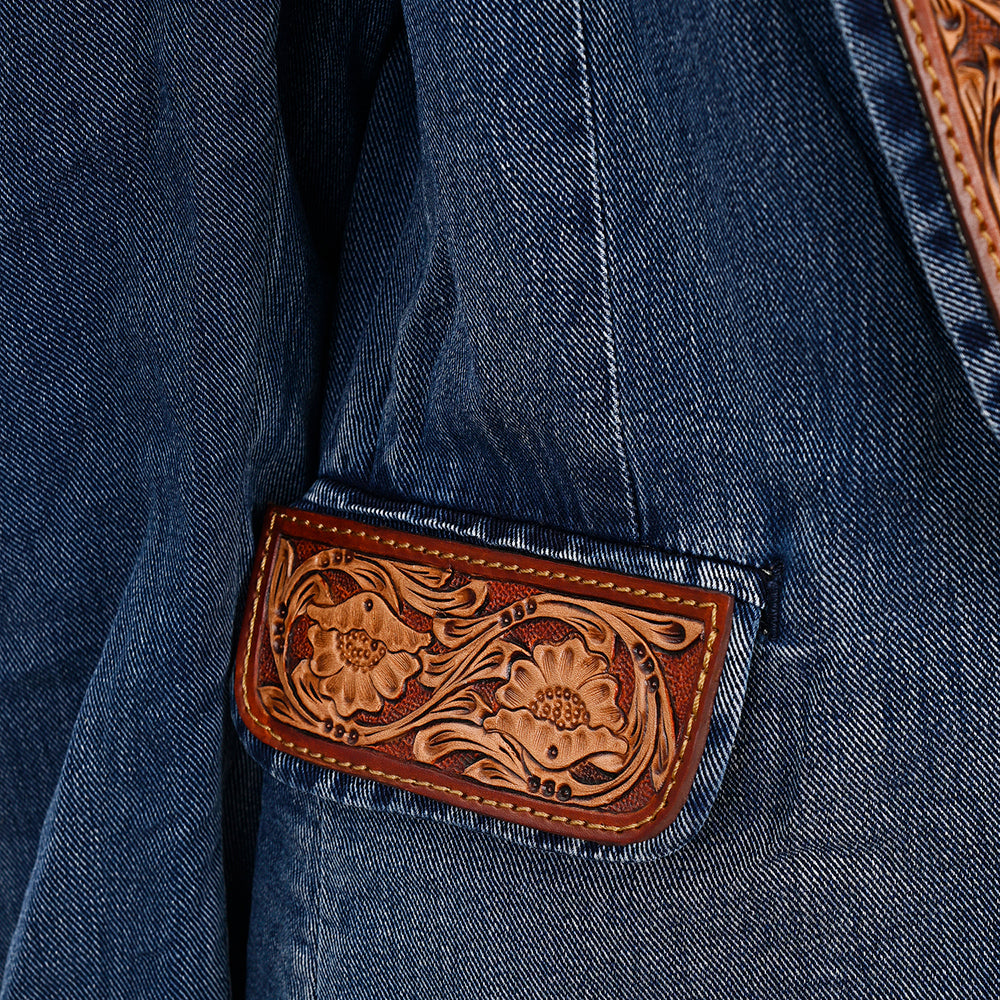 ADBZ040 Genuine leather Hand tooled Women 100% Cotton Denim Blazer dress jacket